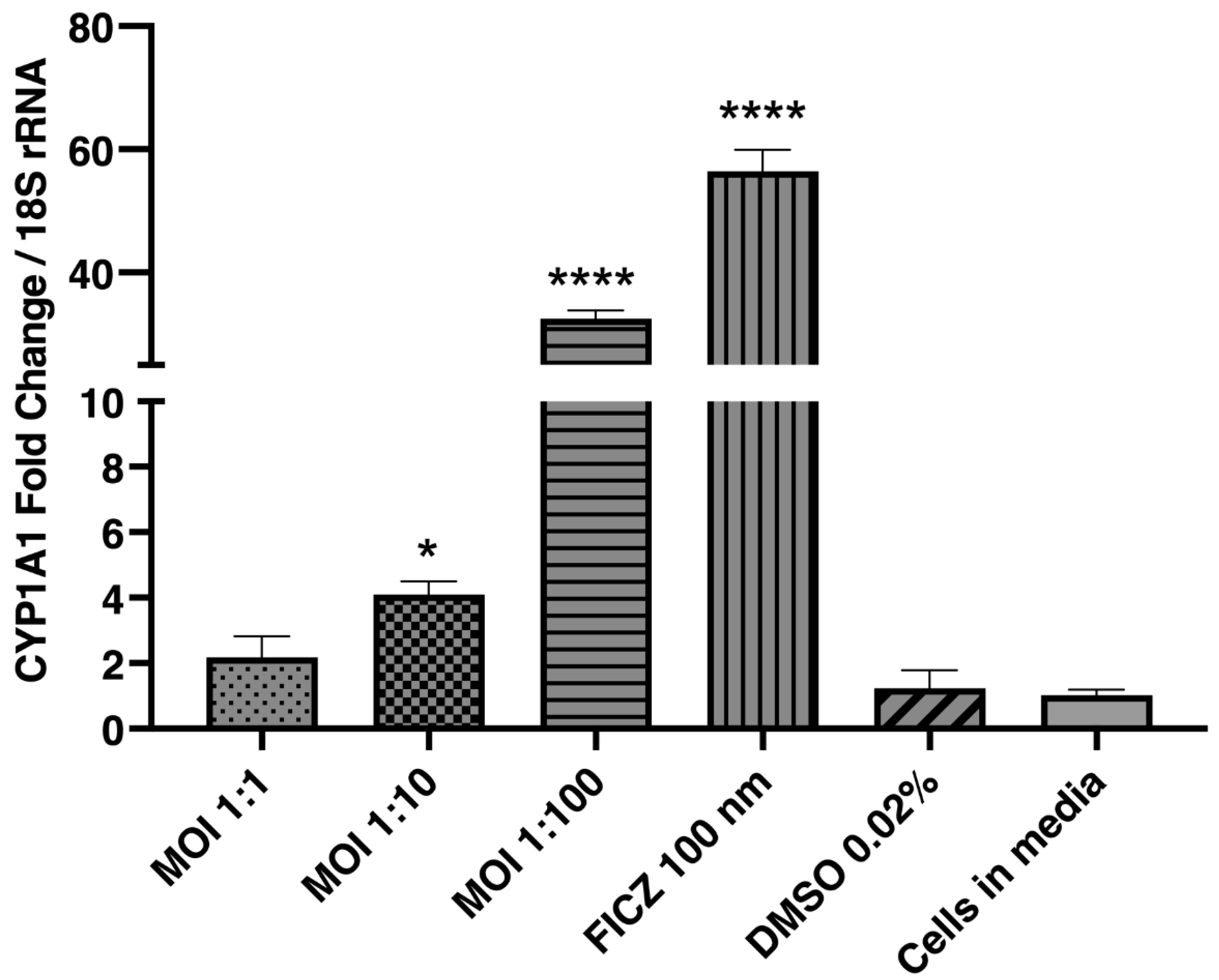 Figure 6. L. murinus upregulates CYP1A1 transcription in an MOI-dependent manner. Caco-2 cells were treated with L. murinus in 10-fold-increasing MOI. CYP1A1 activity was measured by qRT-PCR with 18S rRNA used as an internal control. Cells were treated with 100 nm FICZ as positive control and 0.02% DMSO as vehicle control. All treatments were given for 24 h. There were at least 3 technical replicates per group. The results are expressed as mean ± SEM. The statistical analysis between different groups was performed using one-way ANOVA (F(5,12) = 660.5, p < 0.0001) with post hoc Tukey’s HSD test for comparing multiple treatments. * p < 0.05; **** p < 0.0001.