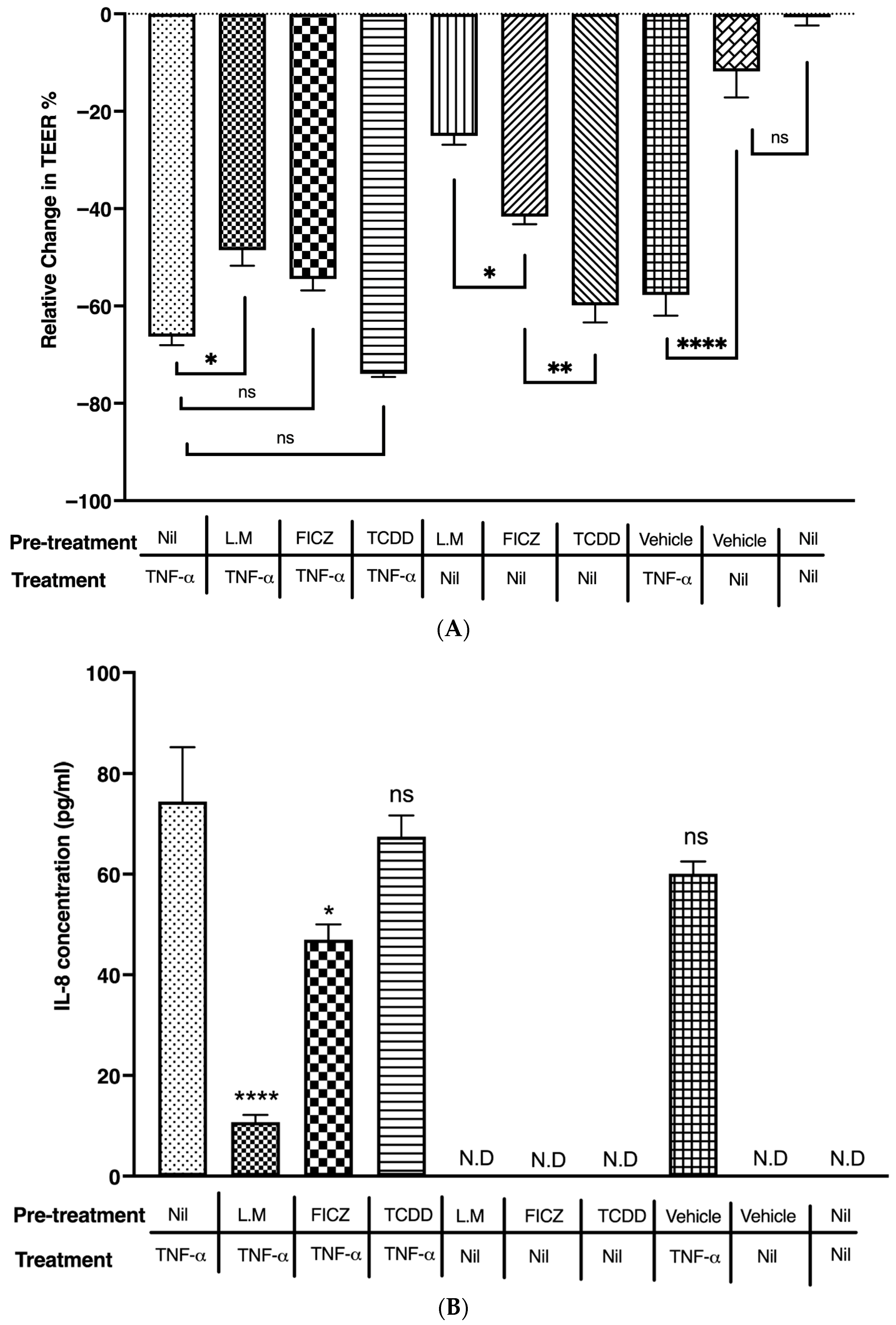 Figure 7. AHR activation attenuates epithelial barrier disruption and pro-inflammatory response in Caco-2 monolayers. Caco-2 monolayers were given respective pre-treatments for 12 h with either L. murinus (MOI 1:100) or FICZ (100 nM) or TCDD (10 nM), followed by 24 h of treatment with TNF-α (10 ng/mL). At the end of 24 h of treatments, TEER and IL-8 were measured to determine the effect of AHR activation on barrier dysfunction (A) and IL-8 secretion (B) from Caco-2 cells. The results are expressed as mean ± SEM. There were at least 3 technical replicates per group (n = 1). In (B), “N.D” indicates “not detected” as IL-8 levels were below the detection limit of the ELISA kit. Statistical analysis for relative change in TEER (A) was performed using one-way ANOVA (F(9,20) = 66.0, p < 0.0001) followed by Tukey’s post hoc test for multiple comparisons. The statistical analysis for IL-8 concentration (B) was performed using one-way ANOVA (F(4,10) = 21.0, p < 0.0001) followed by Dunnett’s multiple comparisons test, comparing each pre-treatment group to the TNF-alpha control. * p < 0.05; ** p < 0.01; **** p < 0.0001.