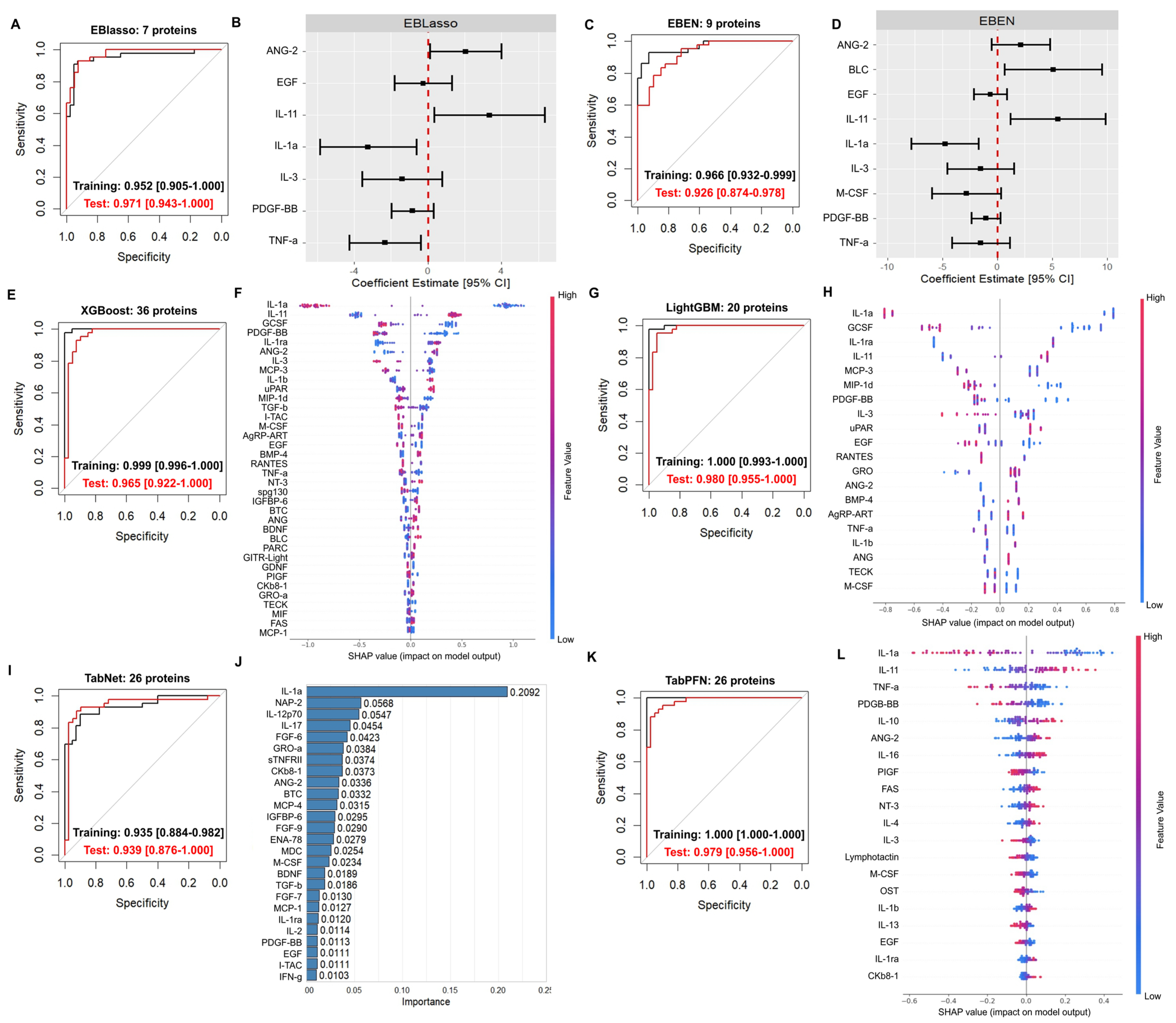 | EBlasso (7 Proteins) | EBEN (9 Proteins) | XGBoost (36 Proteins) | LightGBM (20 Proteins) | TabNet (27 Proteins) | TabPFN (26 Proteins) | |