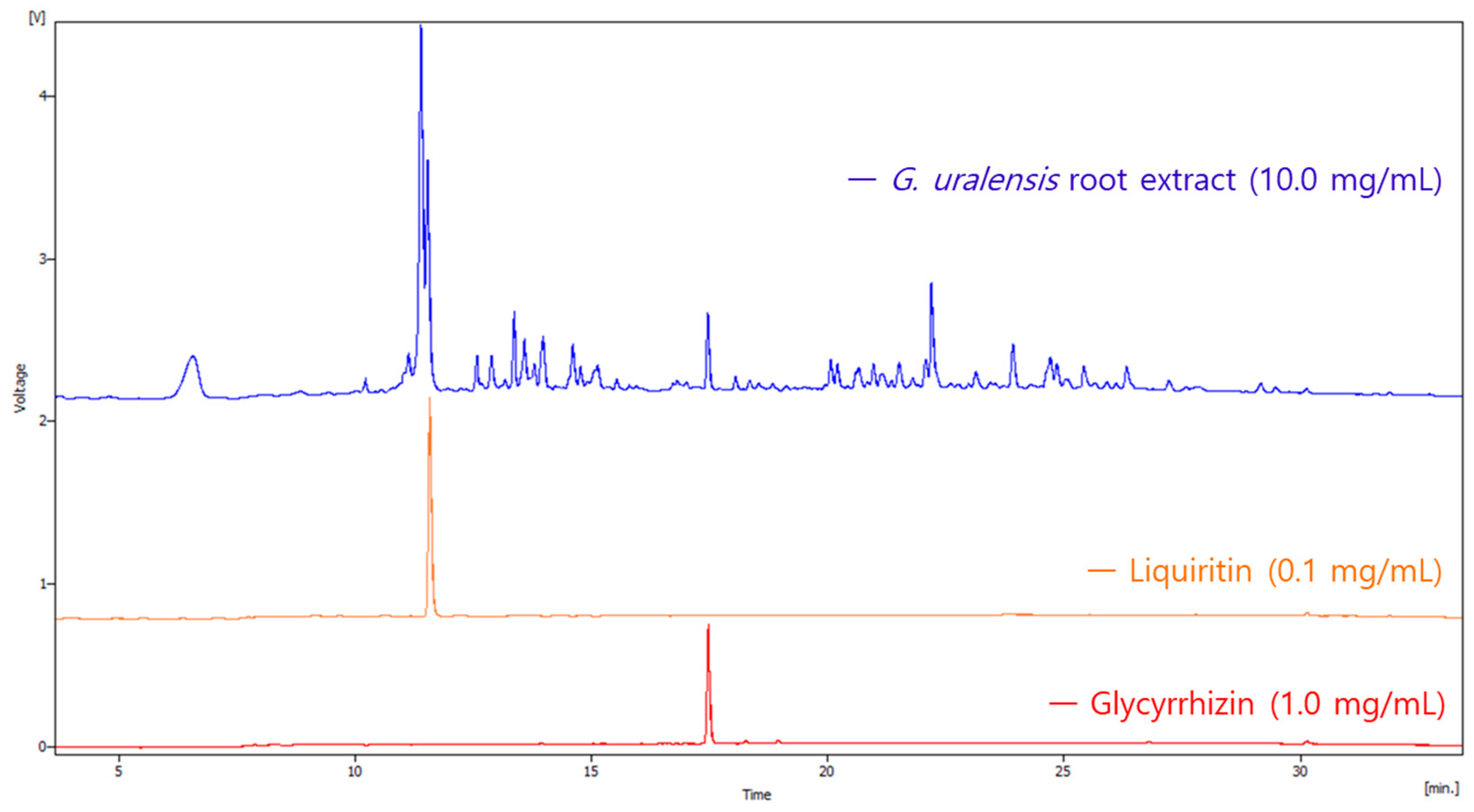 4.2. Identification and Quantification of Chemicals Contained in G. uralensis Root Extract