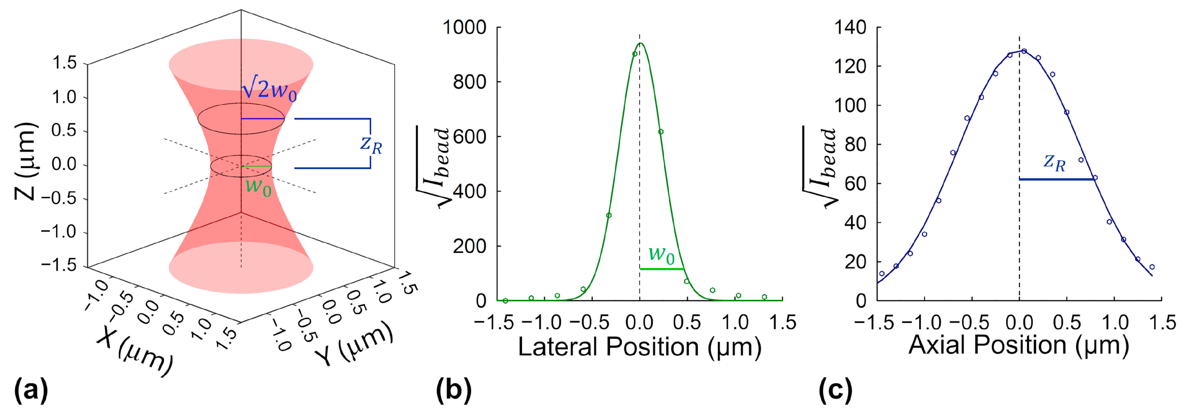 2 radius, a standard measure of beam spread. A similar approach was used axially by scanning through the bead in small steps along the z-direction and fitting the vertical intensity profile. See
