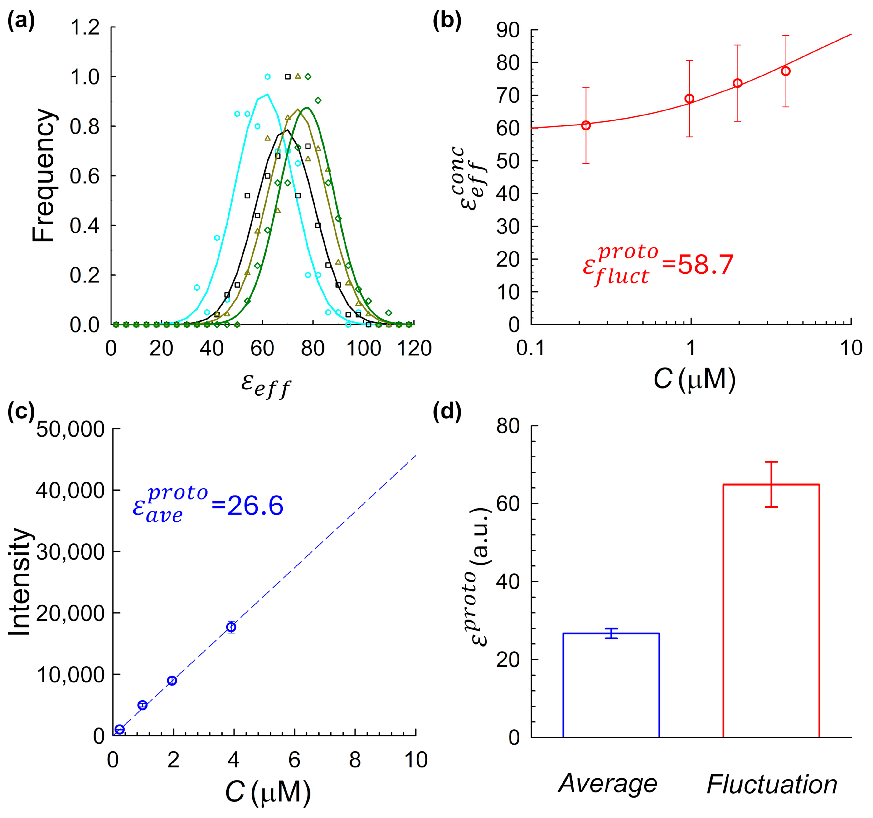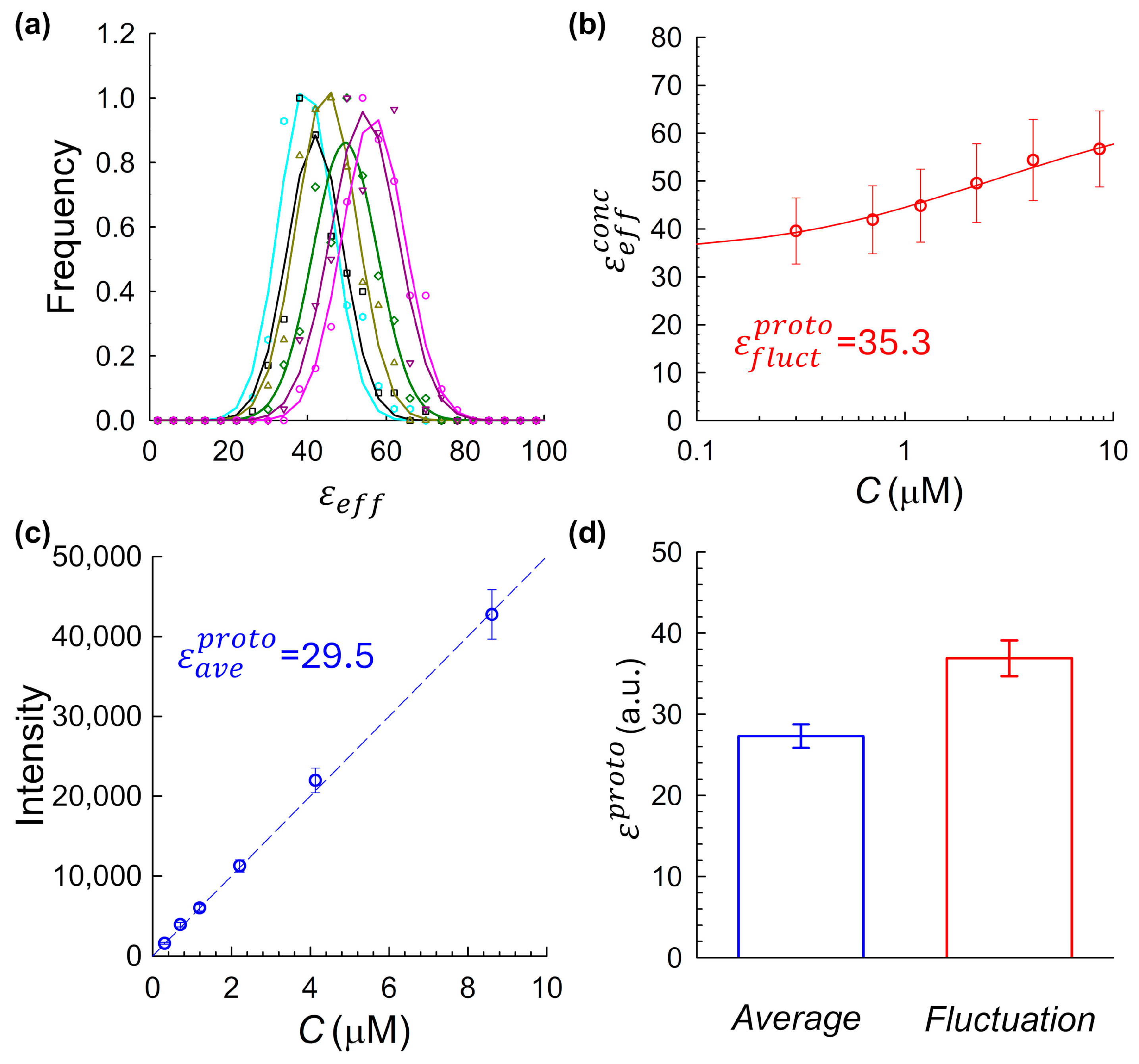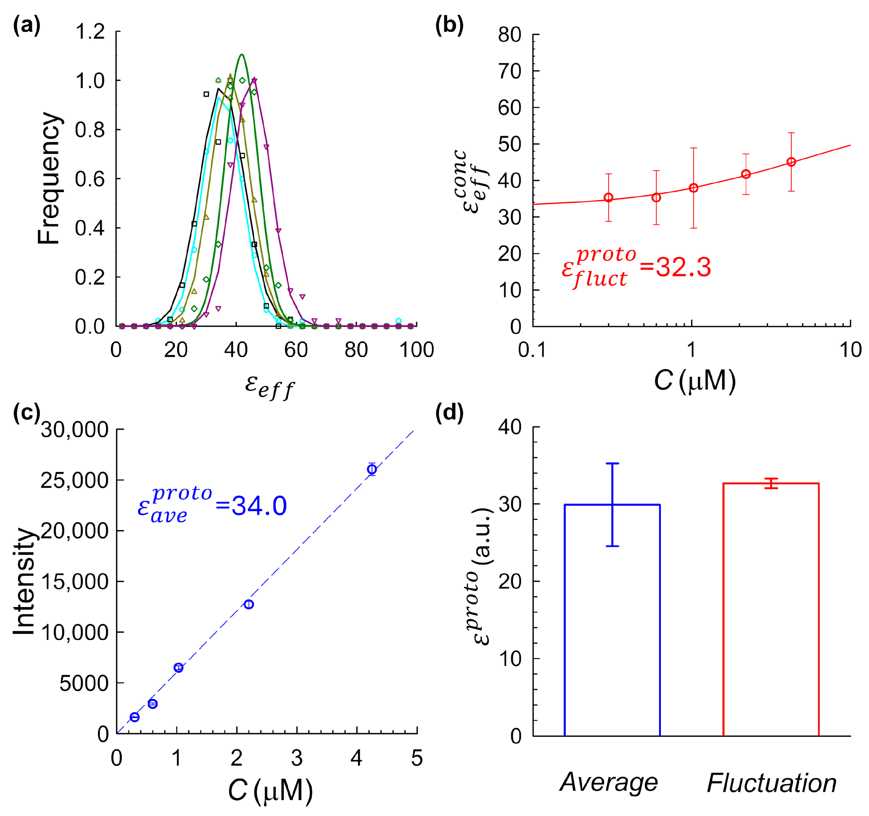 To summarize the notation used throughout this work to describe molecular brightness estimates: we use ε to denote the molecular brightness of a fluorophore. The term refers to the effective brightness measured for a given sample, which could reflect a heterogeneous population of monomers, dimers, and higher-order species. Repeat measurements across different locations within the same sample yield a distribution of values; these are compiled into histograms and fit with Gaussians, and the resulting means are denoted , which represents the mean for a sample for a single concentration. In contrast, a superscript “proto” () indicates a reference monomeric brightness value, measured under conditions chosen to minimize self-association. Subscripts “fluct” () and “ave” () specify the method used to determine monomeric brightness, either via fluctuation-based analysis or average-intensity-based calibration, respectively.