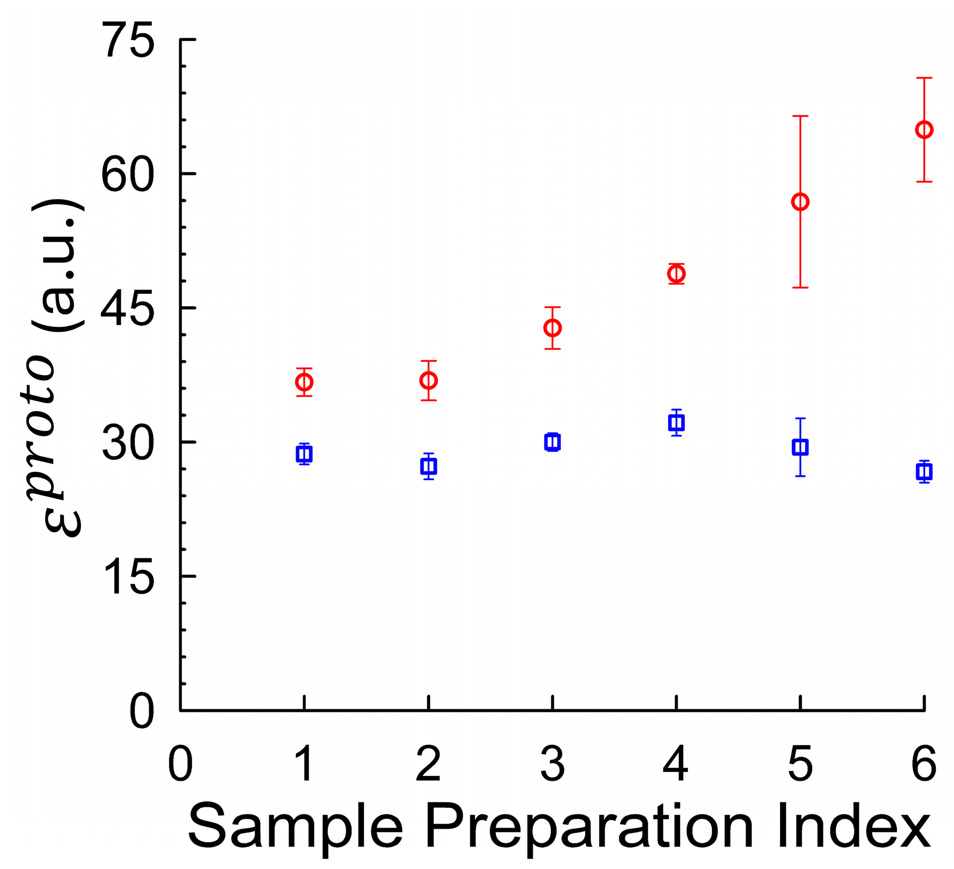 Figure 3 summarizes the results across all six protocols. The fluctuation-derived brightness values (red circles) showed pronounced variability across conditions, ranging from 36.7 to 64.9 units per molecule. In contrast, the average-intensity-derived brightness (blue squares) remained relatively stable, with values clustered between 27 and 32 units. This divergence underscores the sensitivity of fluctuation analysis to even modest aggregation levels, while highlighting the comparative robustness of the intensity-based calibration method.