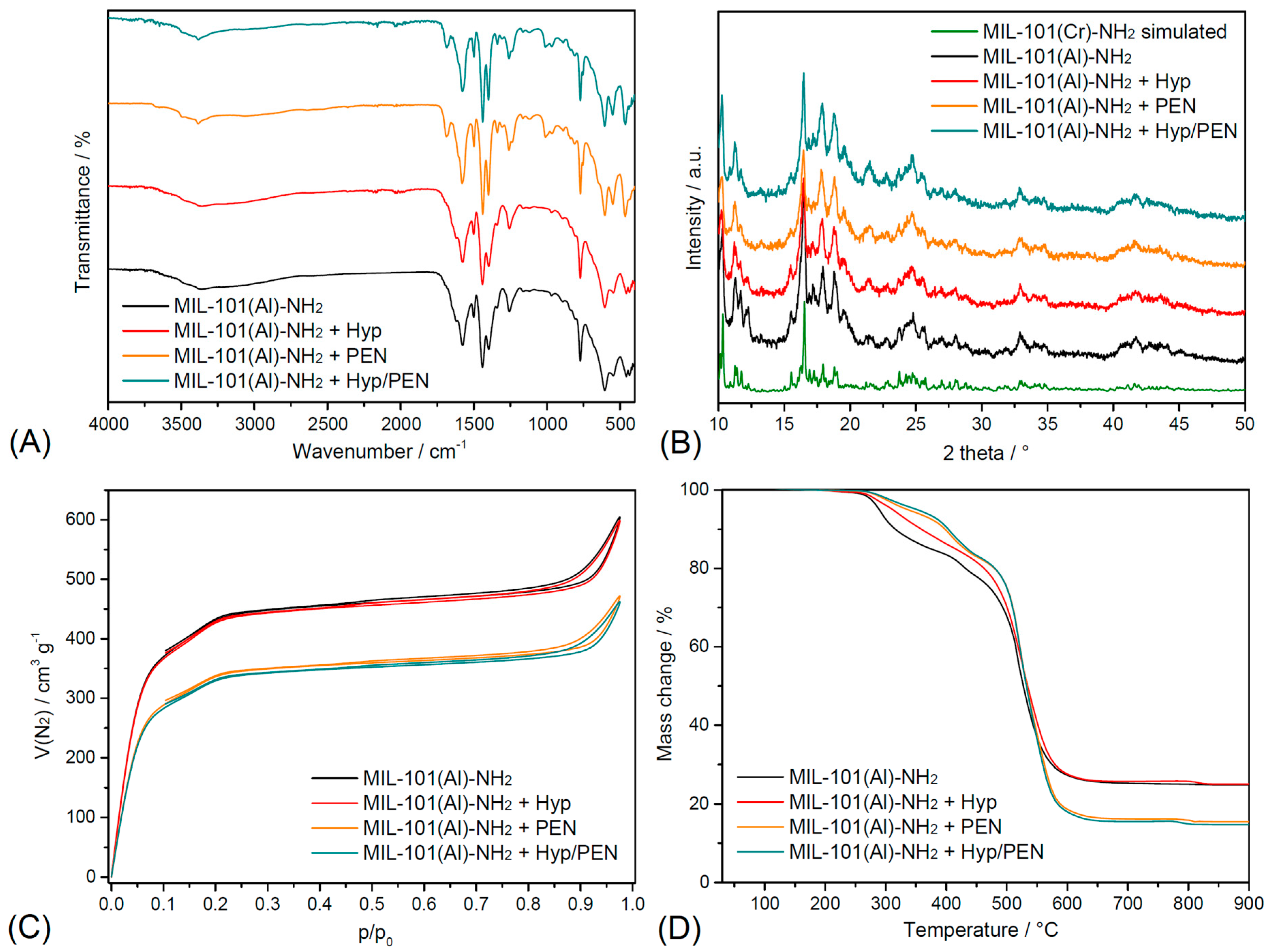 Figure 1. Structural and physicochemical characterization of pristine MIL-101(Al)-NH2 and its drug-loaded composites (Hyp, PEN, Hyp/PEN): (A) FTIR spectra, (B) PXRD patterns, (C) N2 adsorption–desorption isotherms at 77 K, and (D) thermogravimetric profiles.