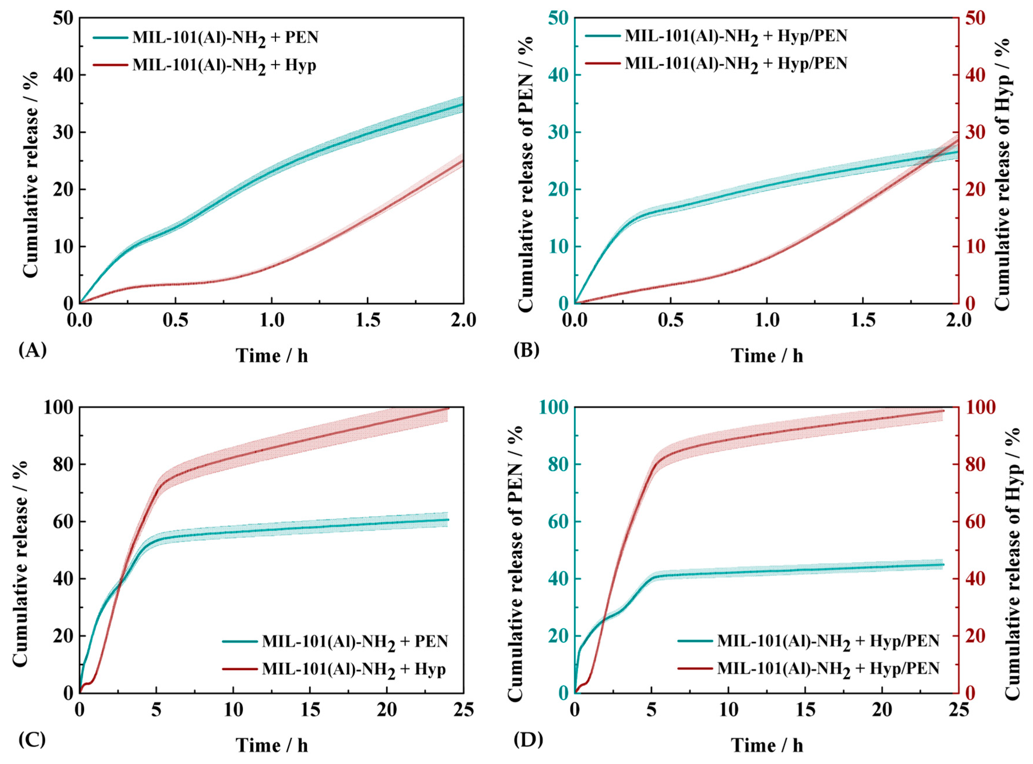 2.3. Drug Release Kinetics Study of MIL-101(Al)-NH2 Loaded with PEN, Hyp and Their Combination