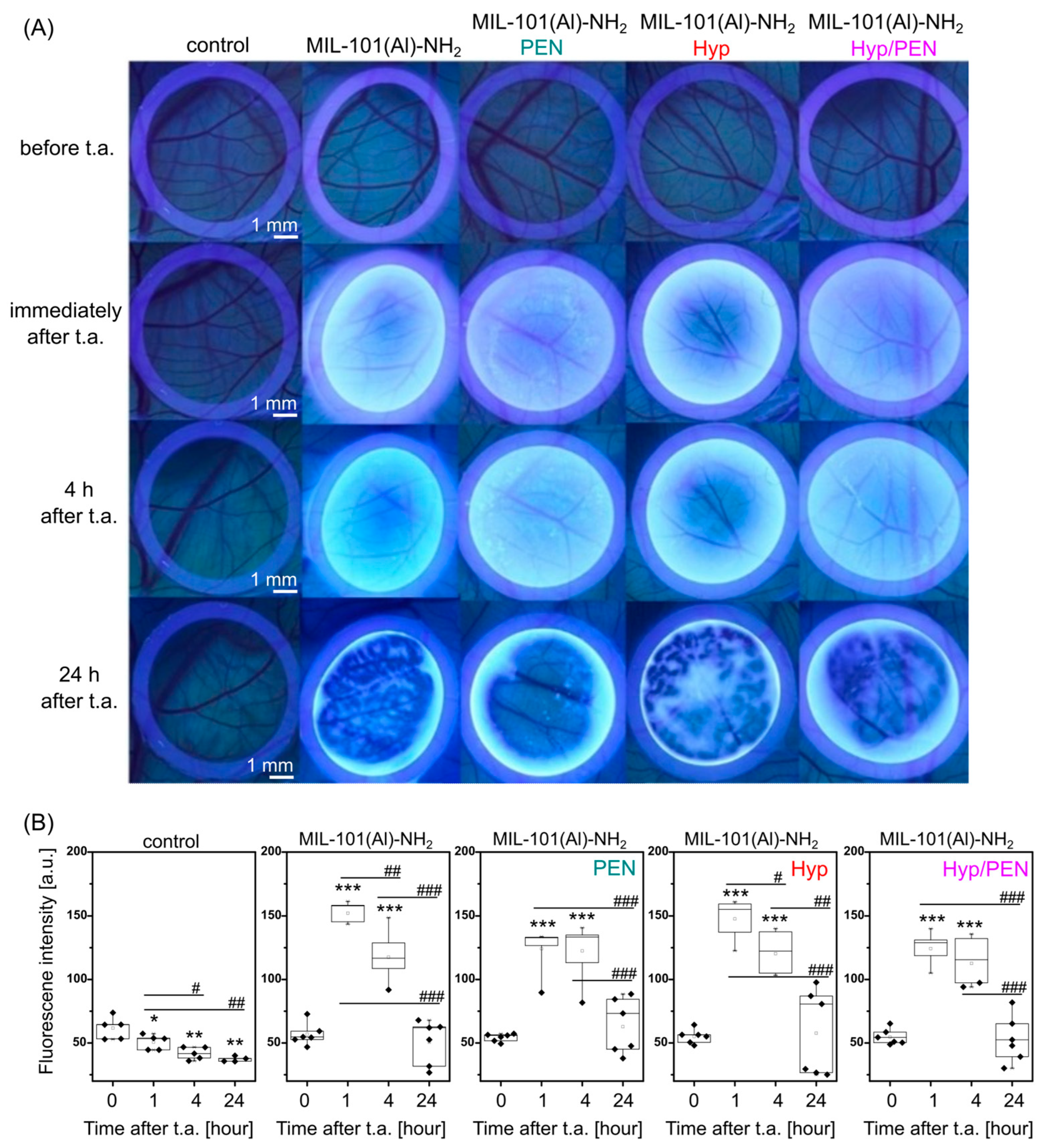Figure 3. Fluorescence pharmacokinetics of MIL-101(Al)-NH2 and MIL-101(Al)-NH2 loaded with PEN, Hyp and their combination on CAM. (A) Fluorescence images of CAM detected in violet light (@ 405 nm) before and after administration of MOFs for 24 h. (B) Analysis of fluorescence intensity is determined as the average value of the image. Levels of significant difference from the control and between samples were determined using an one-way ANOVA test: * p < 0.05, ** p < 0.01, *** p < 0.001, # p < 0.05, ## p < 0.01 and ### p < 0.001.