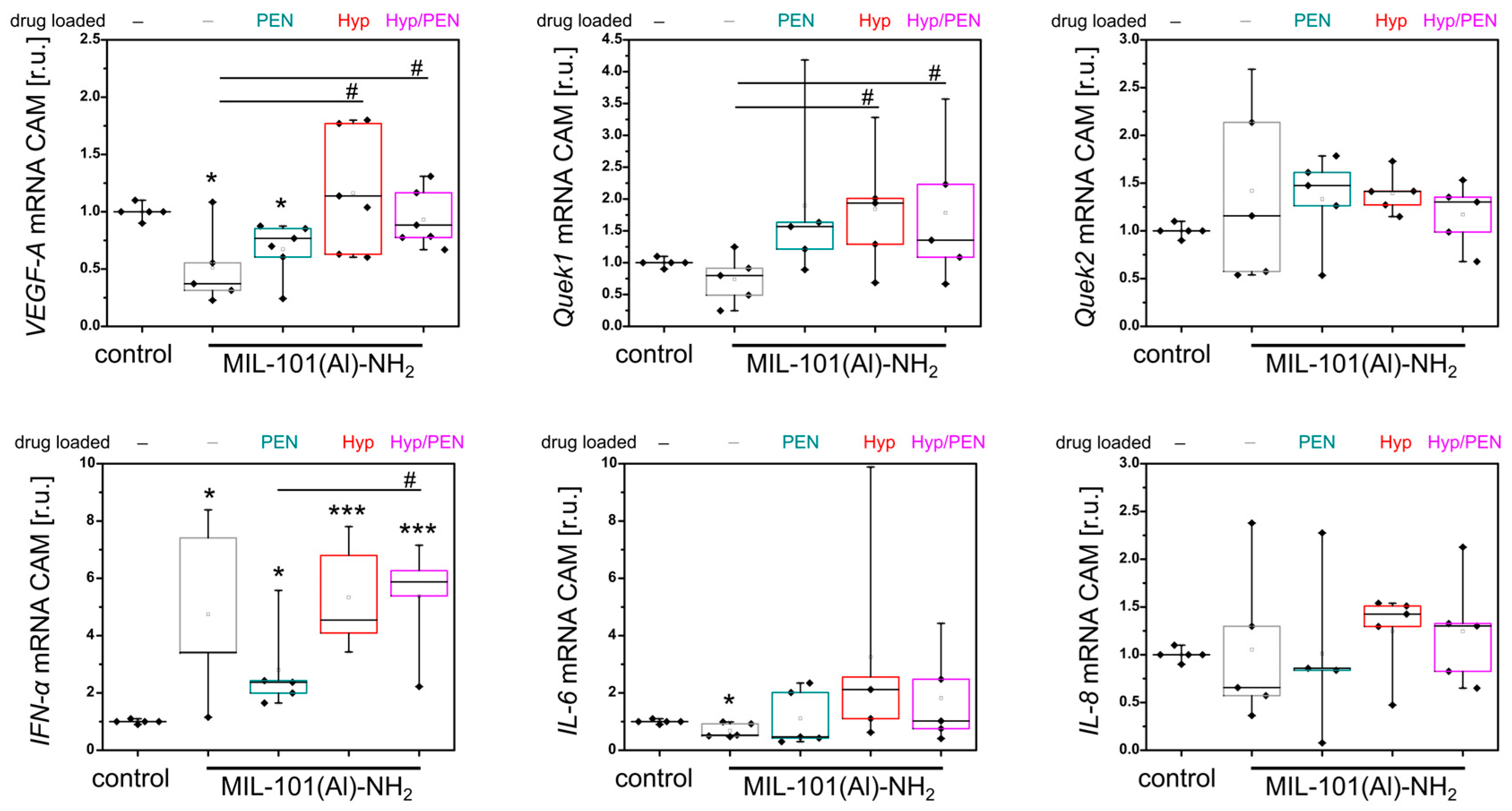 Figure 4. Analysis of VEGF-A, Quek1, Quek2, IFN-α, IL-6 and IL-8 gene expression in CAM after application of MIL-101(Al)-NH2 and MIL-101(Al)-NH2 loaded with PEN, Hyp and their combination for 24 h in the dark. Levels of significant difference from the control and between samples were determined using an one-way ANOVA test: * p < 0.05, *** p < 0.001, # p < 0.05.