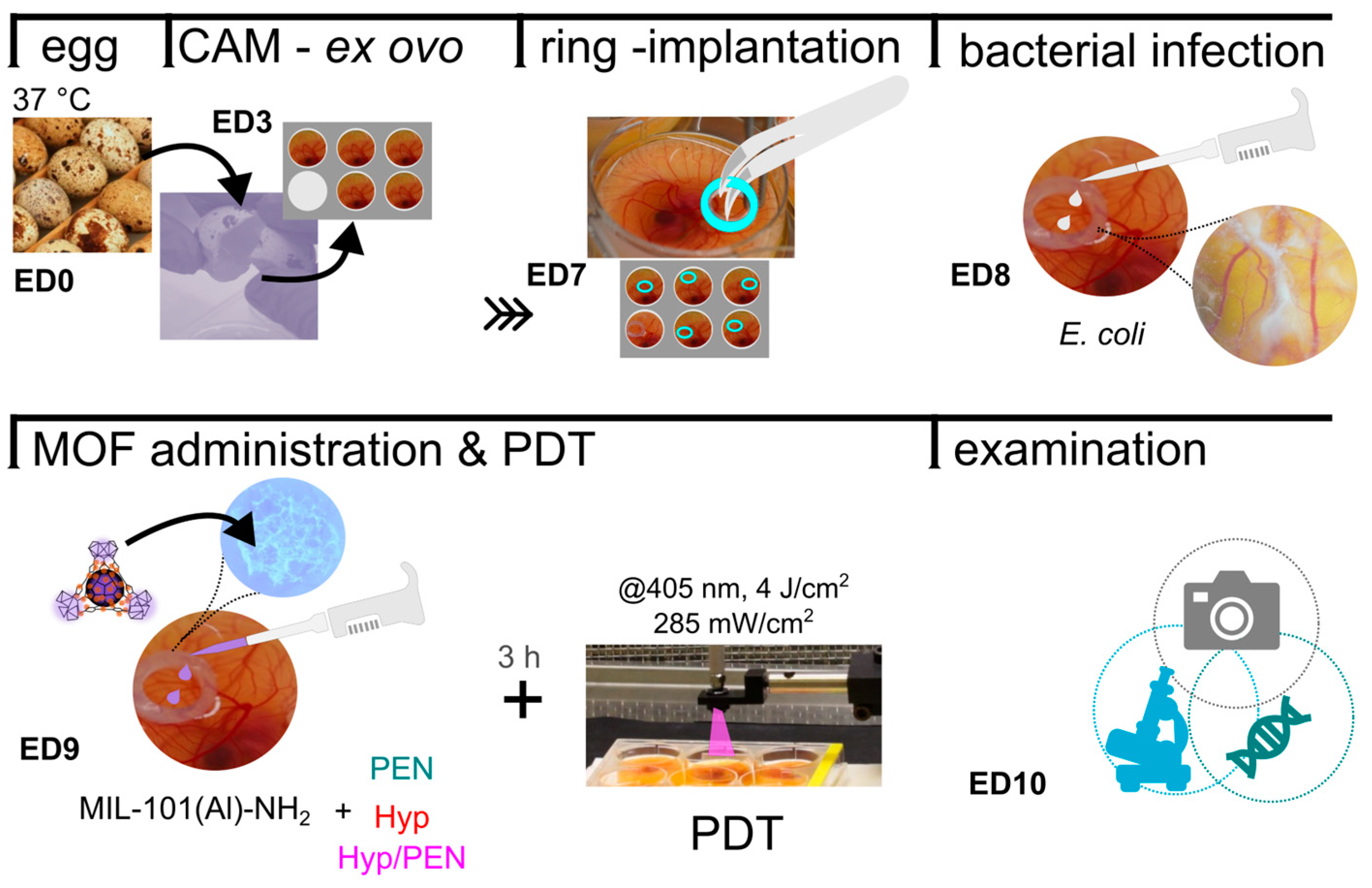 In order to investigate the effect of MOFs on infected tissue, a CAM with bacterial infection was developed. For biosafety reasons, the E. coli strain was used as a model system for bacterial infection. The infected CAM was prepared and analyzed according to the protocol shown in Figure 5.