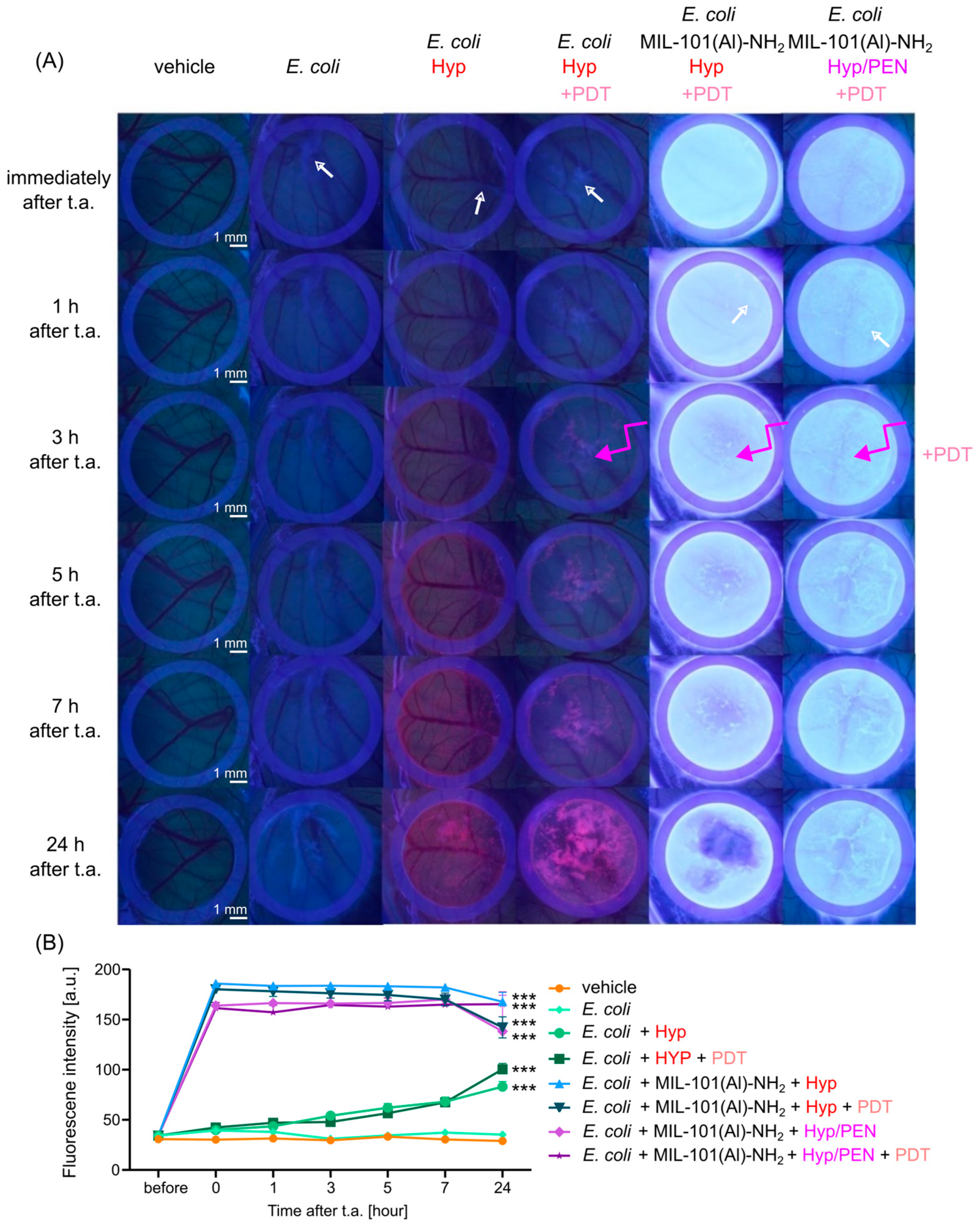 Figure 6. Fluorescence pharmacokinetics of Hyp and MIL-101(Al)-NH2 loaded with Hyp and Hyp/PEN combination on CAM infected with E. coli (white arrow) (A) Fluorescence images of CAM detected in violet light (@ 405 nm) before and after administration of MOFs for 24 h. PDT (@ 405 nm, 4 J/cm2) was performed 3 h (pink arrow) after topical administration (t.a.) of Hyp and MOFs. (B) Analysis of fluorescence intensity is determined as the average value of the image. Levels of significant difference from the control (vehicle) were determined using an one-way ANOVA test: *** p < 0.001.