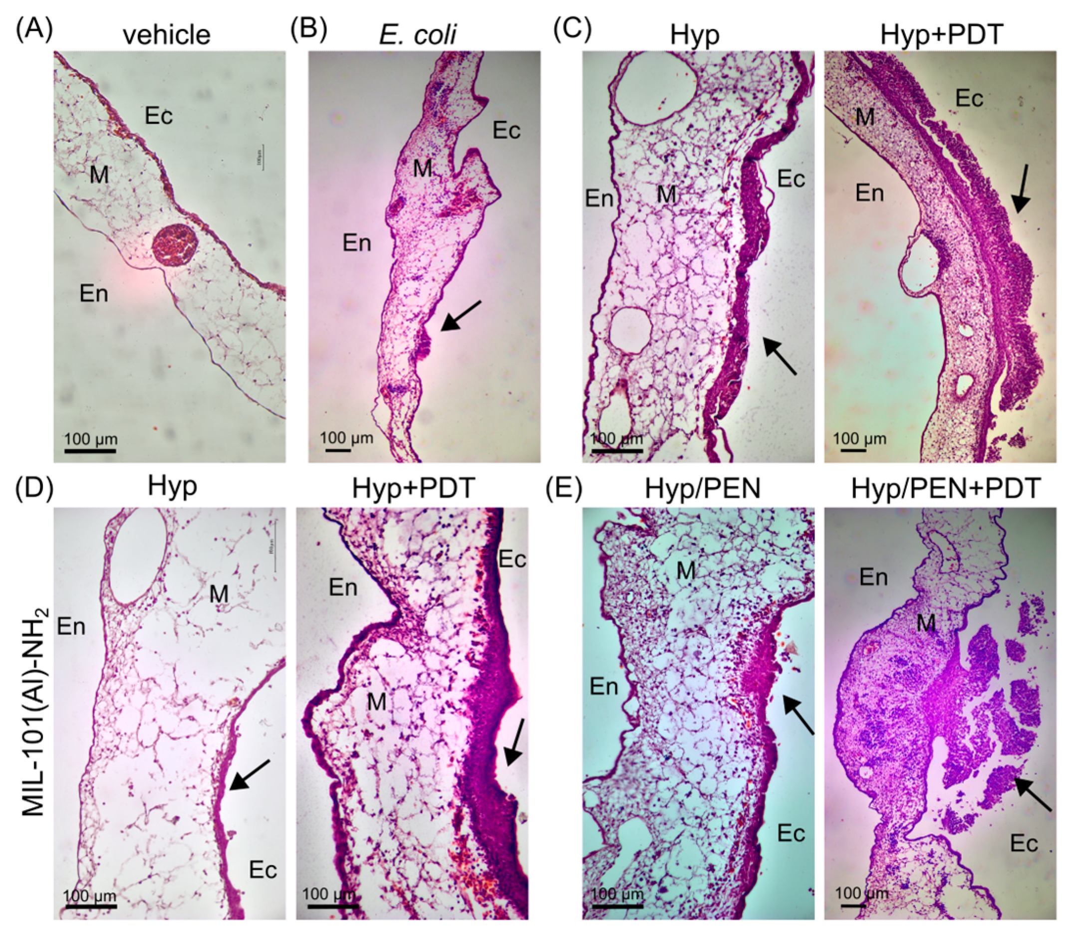 Figure 7. Histological sections of (A) CAM and (B) CAM infected with E. coli (denoted with black arrows) in the presence of (C) Hyp and MIL-101(Al)-NH2 loaded with (D) Hyp and (E) Hyp/PEN combination before and after PDT. Ec-ectoderm, En-endoderm, M-mesoderm, the black arrow indicates inoculation of E. coli. The tissue was labelled with hematoxylin and eosin staining.