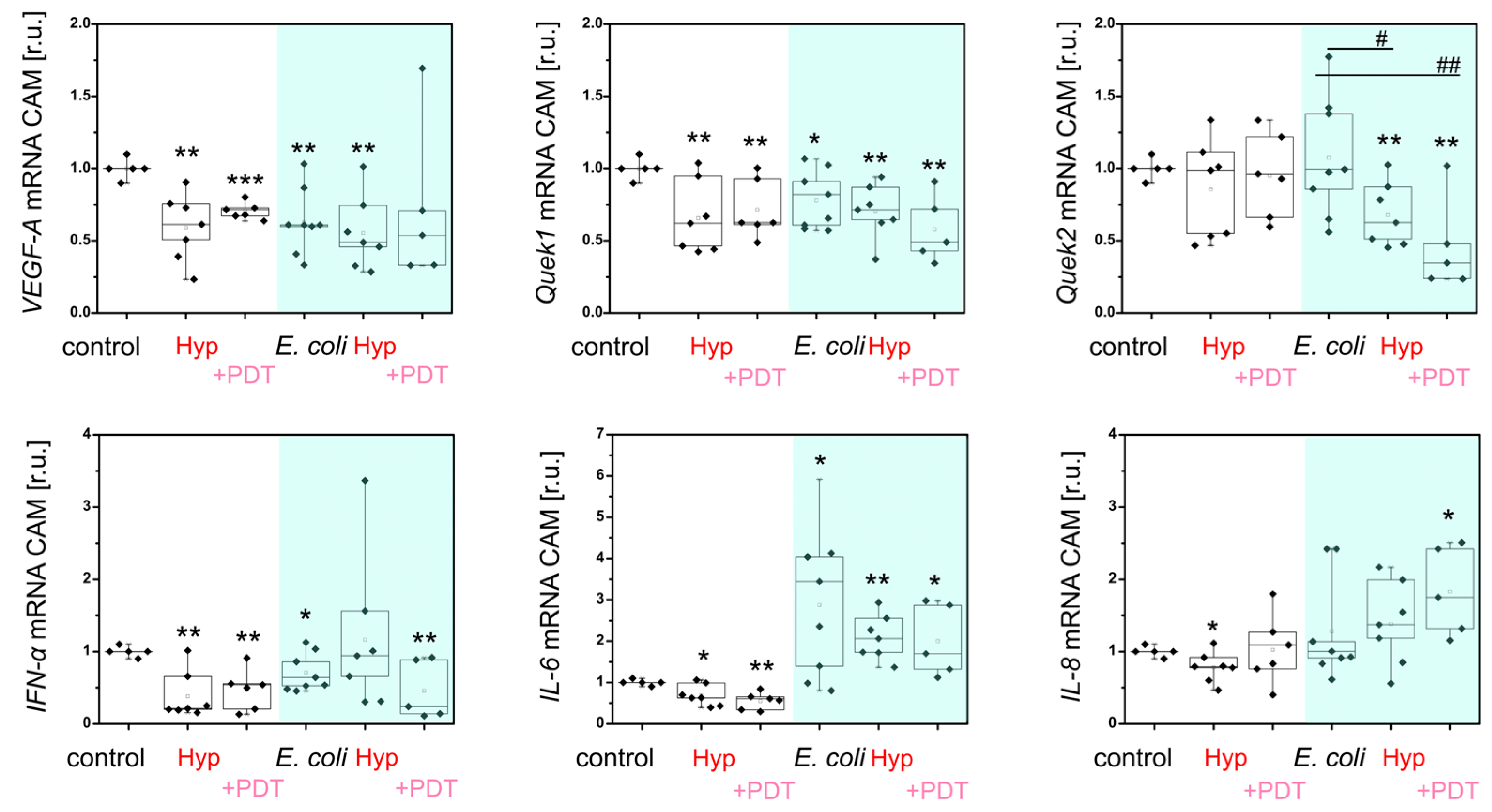 First, we analyzed Hyp and Hyp + PDT with CAM and infected CAM (Figure 8). CAM infected with E. coli shows decreased expression of VEGF-A and Quek1 (angiogenesis) and IFN-α in CAM, but slight overexpression of IL-6 (immunostimulation). Administration of Hyp and PDT resulted in a significant decrease in VEGF-A, Quek1, IFN-α, IL-6 and IL-8. However, in infected CAM, Hyp did not affect VEGF-A, Quek1 and IFN-α, but PDT partially decreased these genes. While Quek2 (lymphogenesis) significantly decreased in infected CAM exposed to Hyp and PDT, IL-6 and IL-8 were overexpressed by these treatments (Figure 8). This suggests that Hyp may play an immunostimulatory role and affect the lymphatic system of CAM.