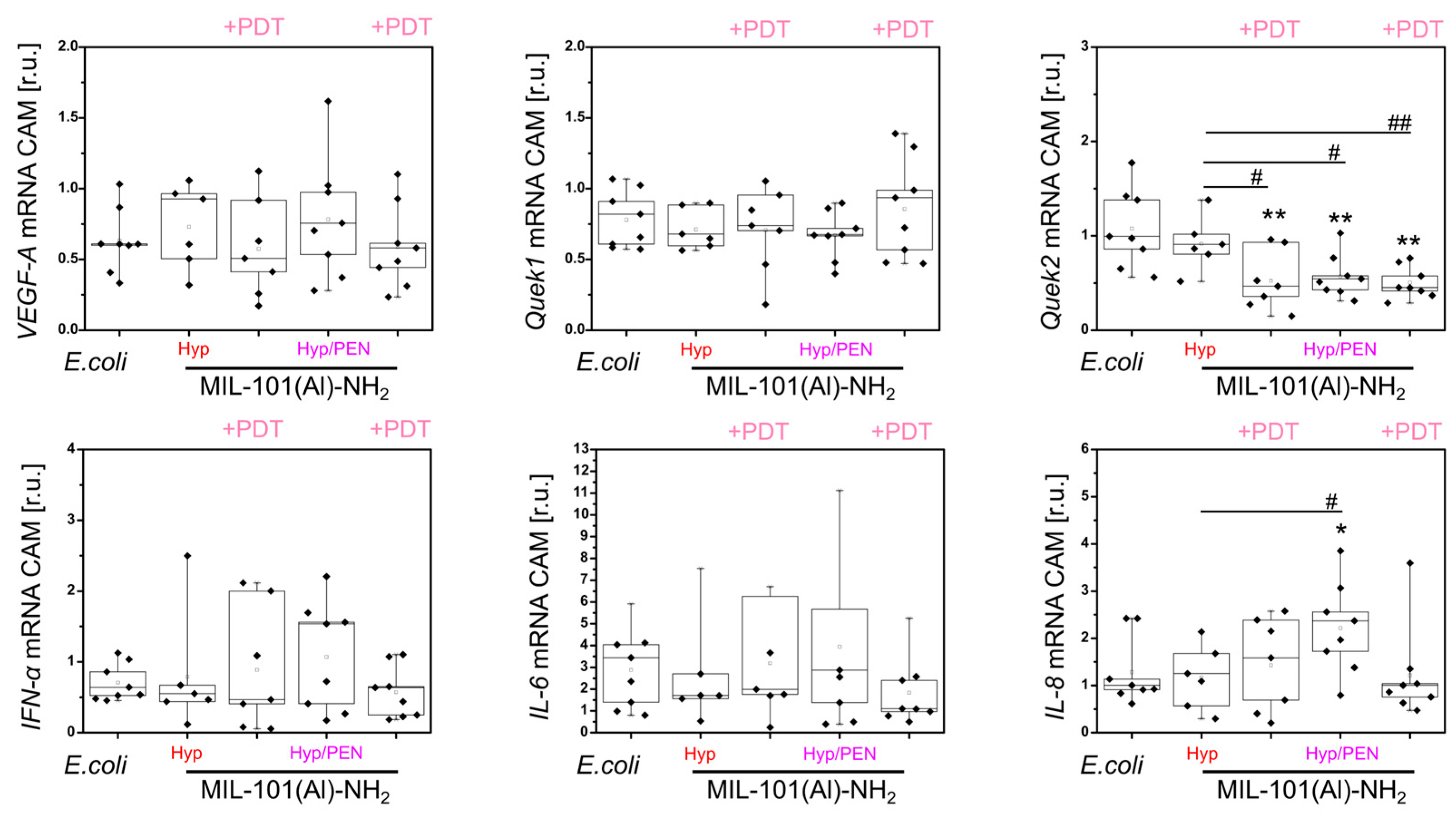 Figure 9. Analysis of VEGF-A, Quek1, Quek2, IFN-α, IL-6 and IL-8 gene expression in CAM infected with E. coli after application of MIL-101(Al)-NH2 loaded with Hyp and Hyp/PEN for 24 h in the dark and with PDT (@ 405 nm, 4 J/cm2) 3 h after administration. Levels of significant difference from the control and between samples were determined using an one-way ANOVA test: * p < 0.05, ** p < 0.01, # p < 0.05, ## p < 0.01.