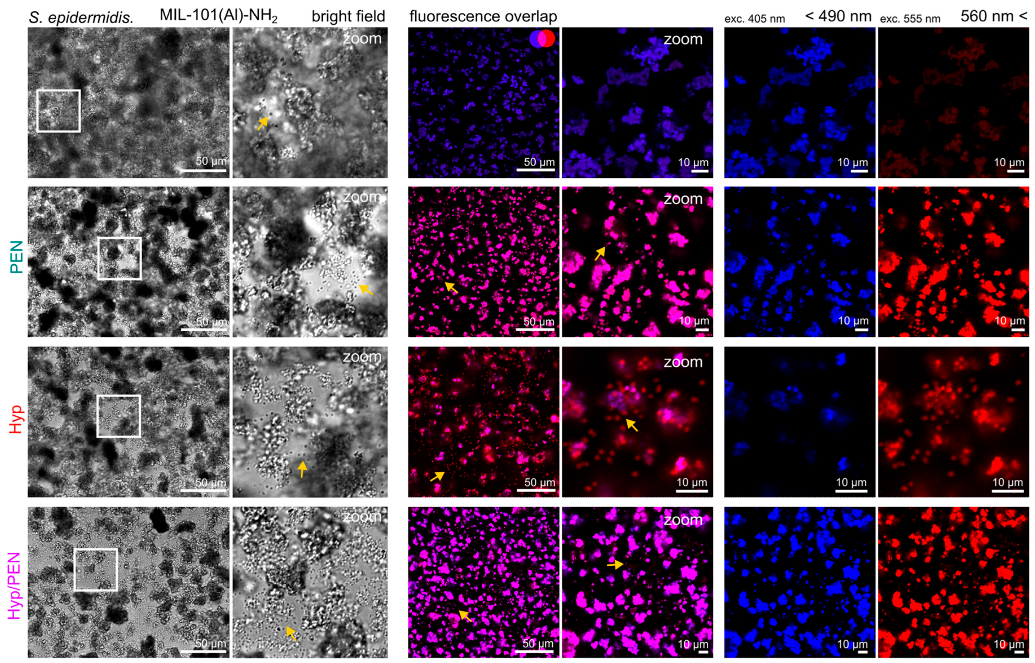 Figure 10. Bright field and fluorescence images of MIL-101(Al)-NH2 and MIL-101(Al)-NH2 loaded with PEN, Hyp and their combination in the presence of S. epidermidis. Fluorescence of the MOFs was detected in blue and red spectral regions. Hyp absorbed in bacteria is shown in red. Localization of bacteria is indicated with a yellow arrow. Overlap of blue and red signals at the same pixel position is indicated in pink. The white square indicates the region of interest, which is zoomed.