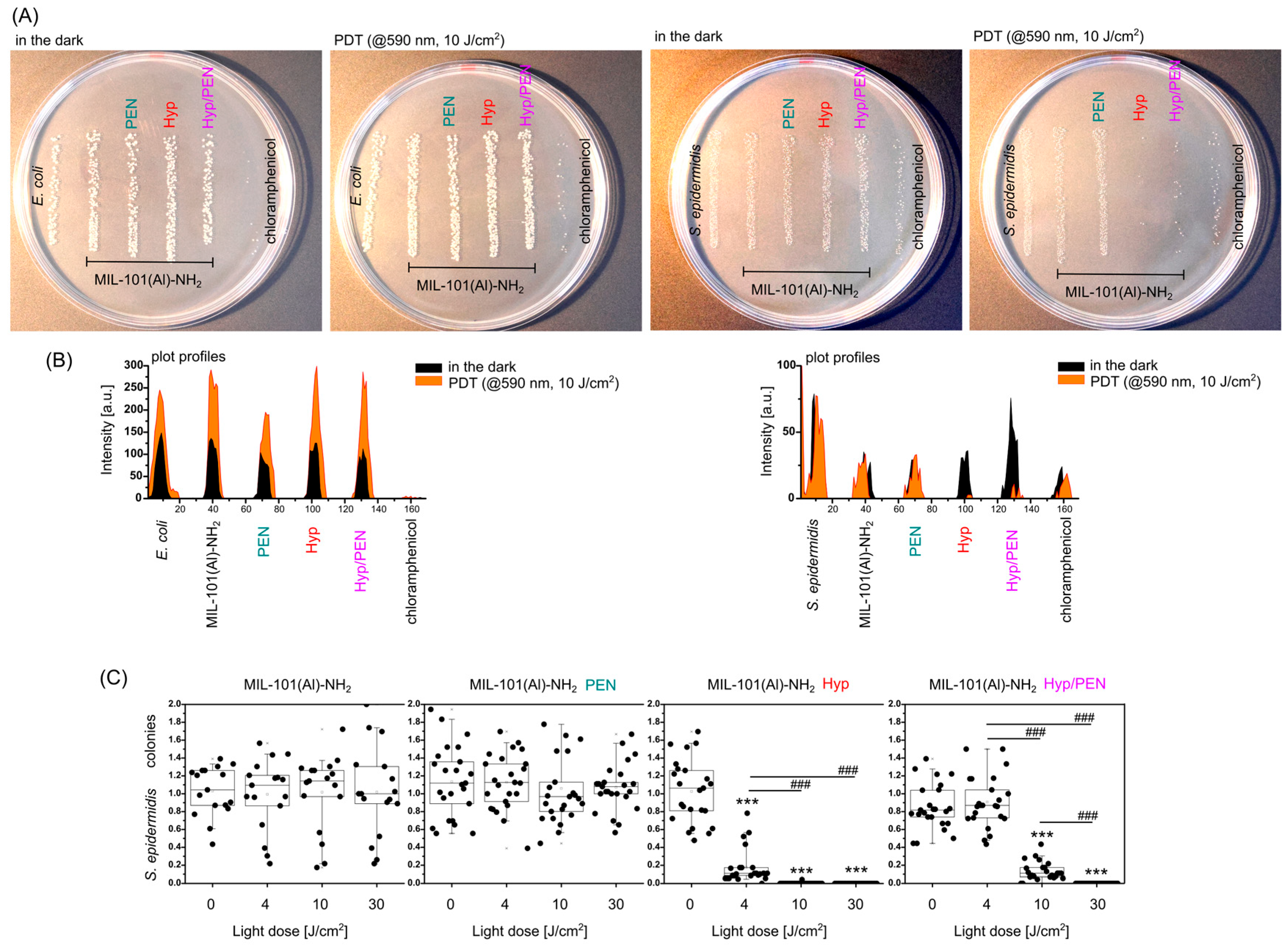 Figure 11. Inhibition of bacteria (E. coli and S. epidermidis) in the presence of MIL-101(Al)-NH2 and MIL-101(Al)-NH2 loaded with PEN, Hyp and their combination. (A) Images of bacterial colonies kept in the dark and after PDT (590 nm, 4–30 J/cm2). (B) Plot profiles of the images with colonies. (C) Analysis of S. epidermidis colonies after PDT at 0–30 J/cm2. Levels of significant difference from the control and between samples were determined using an one-way ANOVA test: *** p < 0.001, ### p < 0.001.
