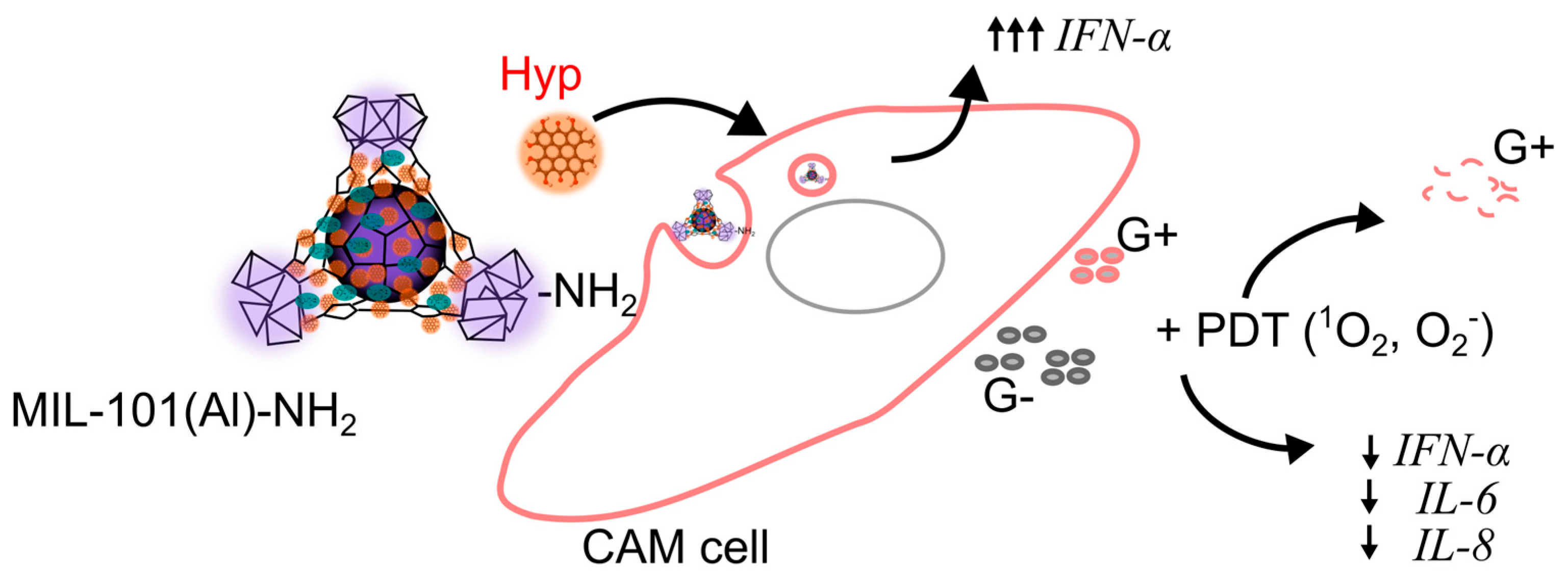 Figure 12. Schematic representation of MIL-101(Al)-NH2 and Hyp mechanism on immunostimulation in CAM and PDT effect on bacteria (Gram-positive (G+), Gram-negative (G−)).