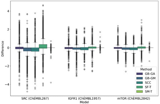 We evaluated the impact of molecular mutation on the conservation of their relevant features. We generated QSAR models using the random forest algorithm against known therapeutic targets of SRC (ChEMBL267), IGF1R (ChEMBL1957), and mTOR (ChEMBL2842) proteins using preprocessed information from the ChEMBL database. Subsequently, we calculated the pIC50 potency of both the original molecules and the molecules generated by different methods, and we estimated the differences, as shown in Table 3 and Figure 2 and Figure 3.