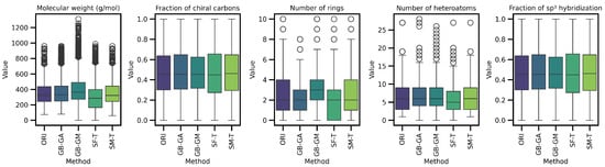 Finally, we employed Kullback–Leibler (KL) divergence to compare the distribution of these descriptors between the original and mutated molecules, as illustrated in Table 8. The SCC method exhibited the most significant differences in five out of the seven descriptors measured. For clarity, Table 9 ranks the methods by the magnitude and direction of changes in the characteristics of the mutated molecules.