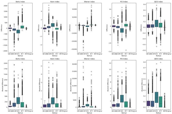 Boxplot of the distribution of the average differences in complexity indices between the original and mutated molecules, and according to GB-GA, GB-GM, SCC, SF-T, and SM-T.