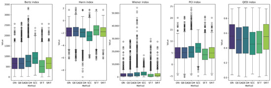 Boxplot of the distribution of the original distribution of complexity indices in complexity indices between the original and mutated molecules, according to GB-GA, GB-GM, SCC, SF-T, and SM-T.
