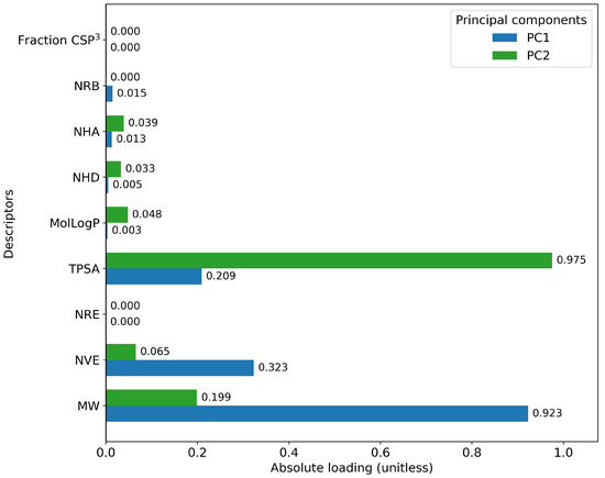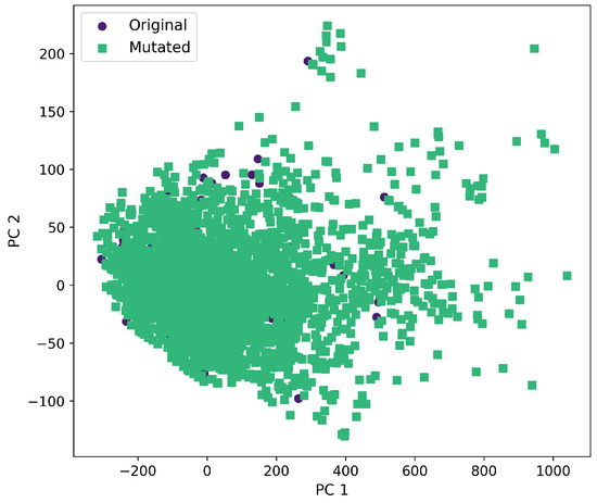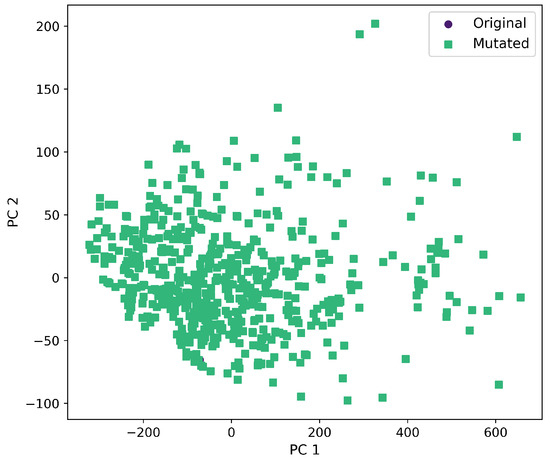 Furthermore, a comprehensive set of molecular descriptors was calculated, followed by the application of Principal Component Analysis (PCA) to identify the two principal components. Figure 10 shows the significance of each descriptor within these components, where Molecular Weight and TPSA emerged as the most influential. To visualize the distribution of the original and mutated molecules, we generated scatterplots, as shown in Figure 11, Figure 12, Figure 13, Figure 14 and Figure 15. These scatterplots show how the SCC method produced the highest contrast between original and mutated molecules.