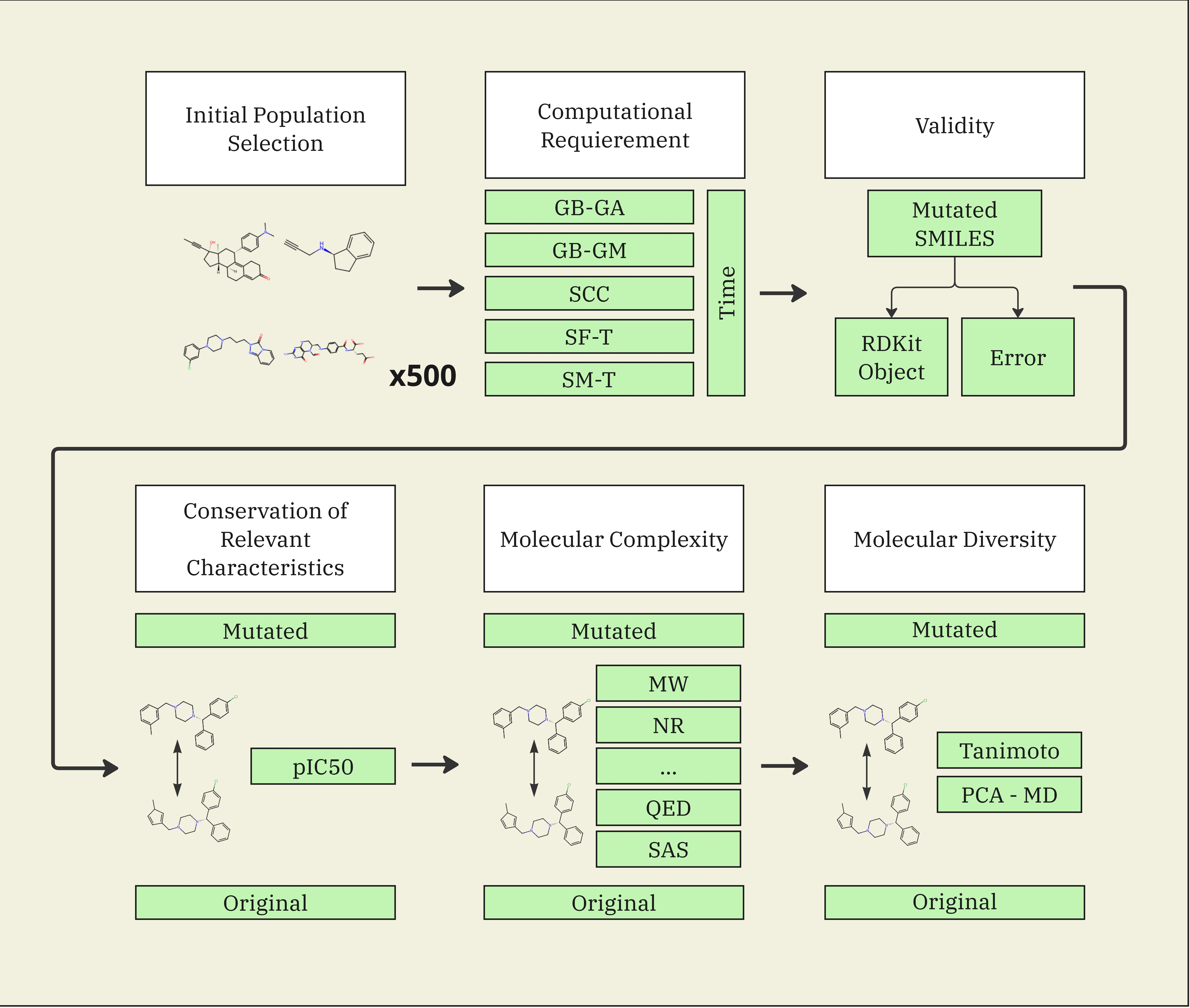 - We provide a reproducible framework comparing five mutation operators (GB-GA, GB-GM, SCC, SF-T, SM-T) on a common FDA-approved seed set from ZINC20, under a standardized mutation budget (1/3/5) and metrics (validity, runtime, bioactivity conservation, complexity, and diversity).