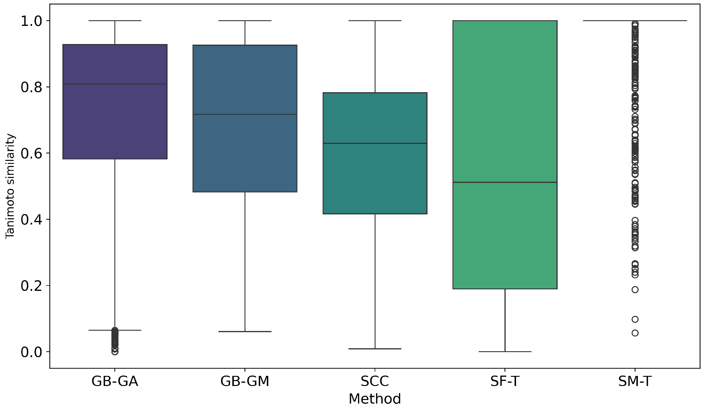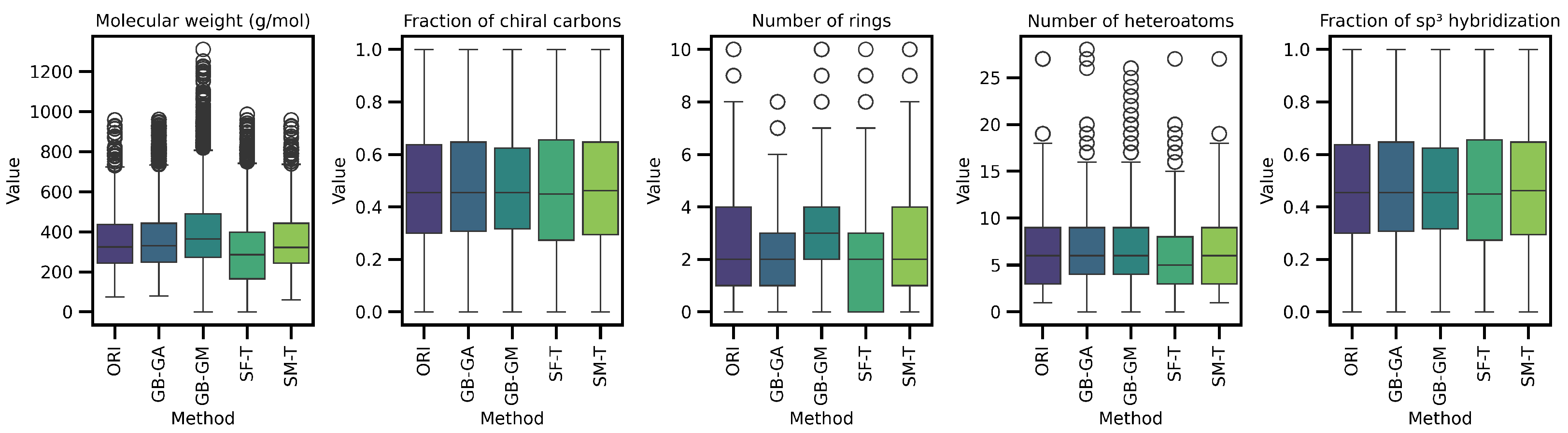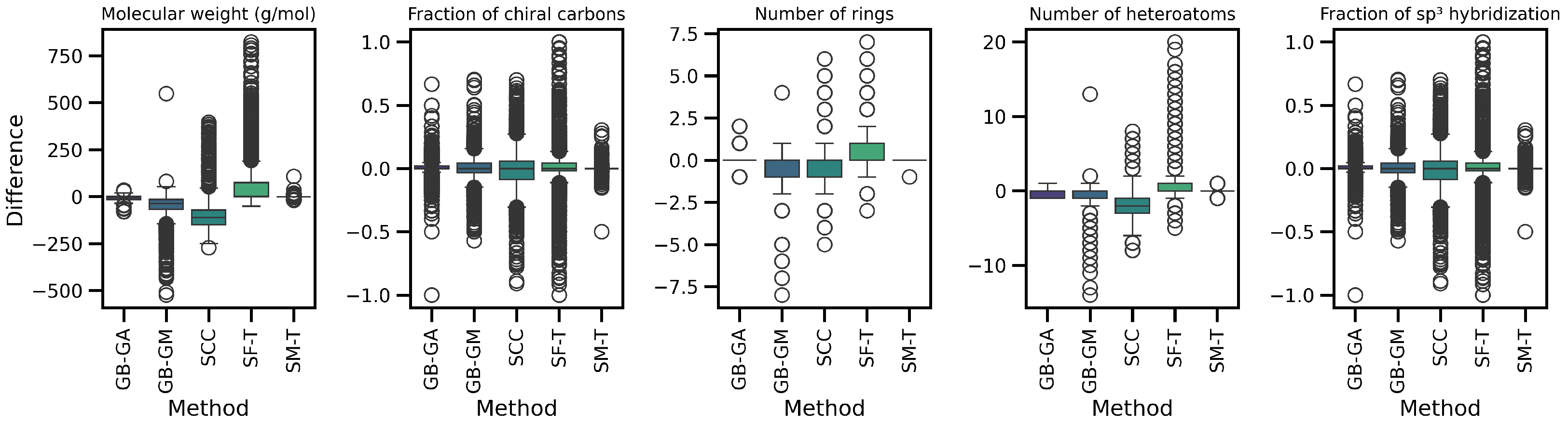 - We generate an actionable selection guide, in which we translate results into practical recommendations. For example, use GB-GA for fast, high validity local optimization; SCC for reaction-based growth with property shifts; SF-T for rapid, high-diversity exploration; GB-GM for data-consistent (often heavier) chemistries; and reserve SM-T for quick prototypes due to low validity.