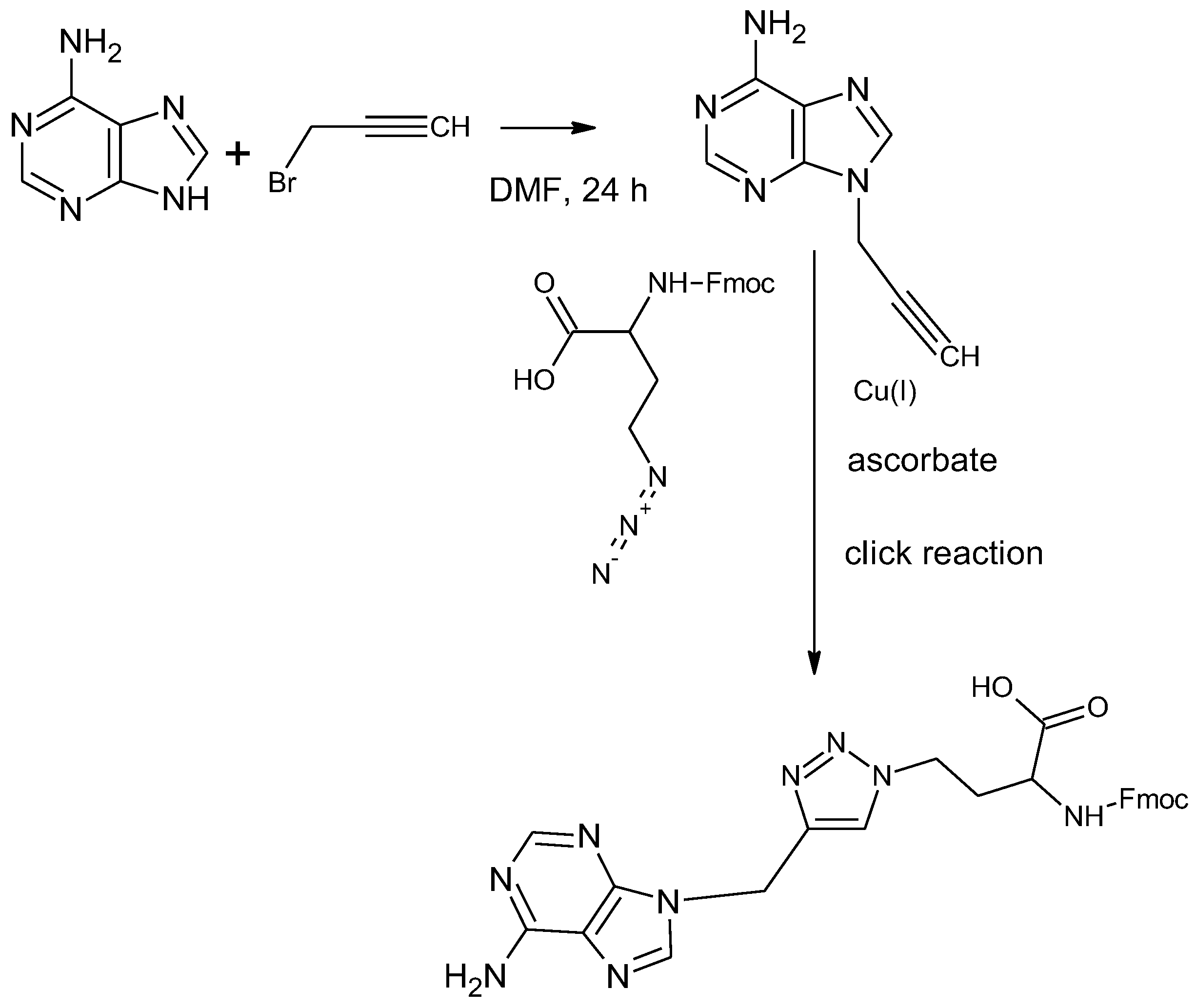 2.1. Synthesis of N9-propargyladenine and Fmoc-1,4-TzlNBAA
