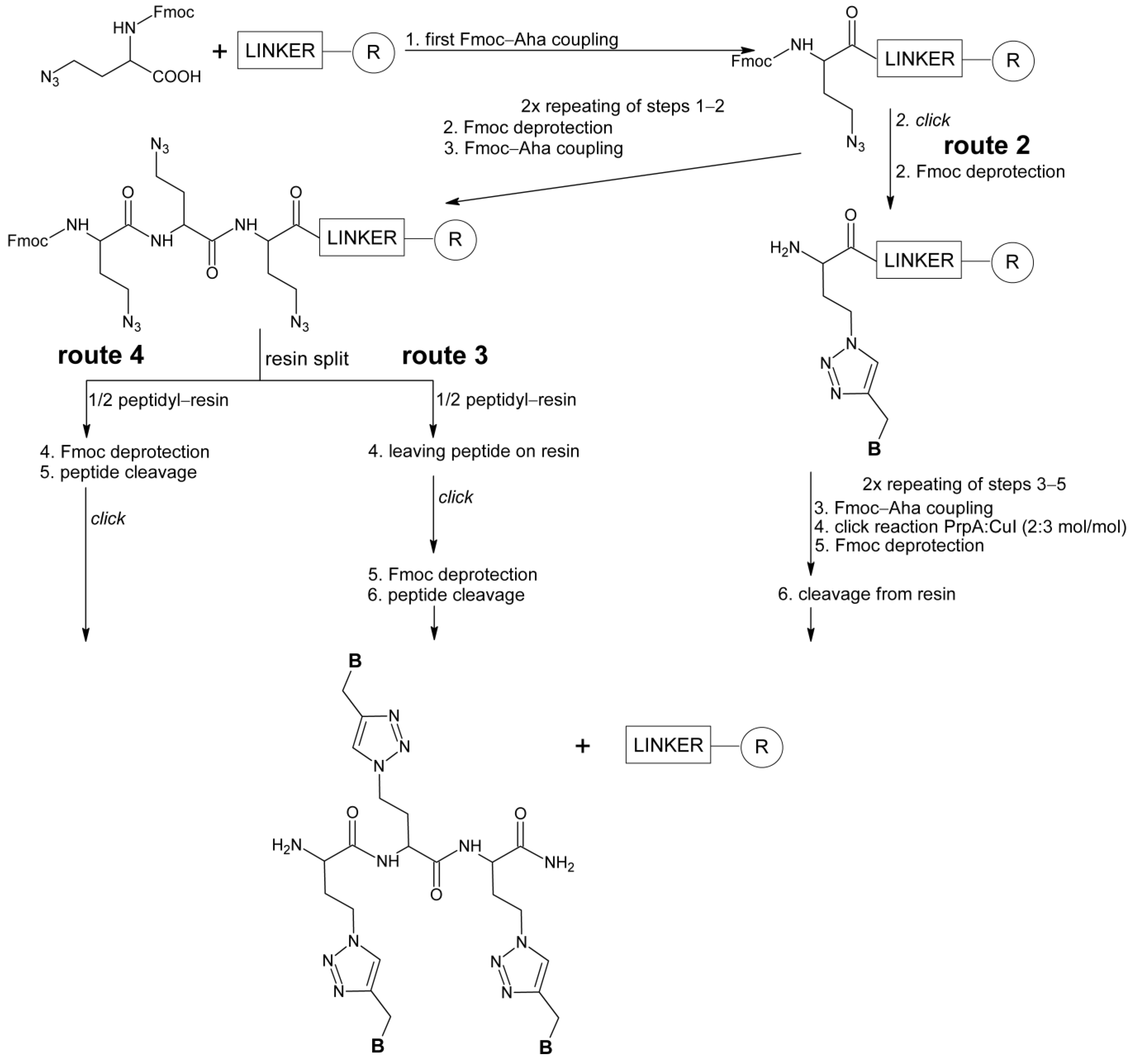 3.3.3. Solid-Phase Synthesis of HalTzlAAA with a Simultaneous All 1,4-TzlNBAA Residues Click on Resin (Route 3)