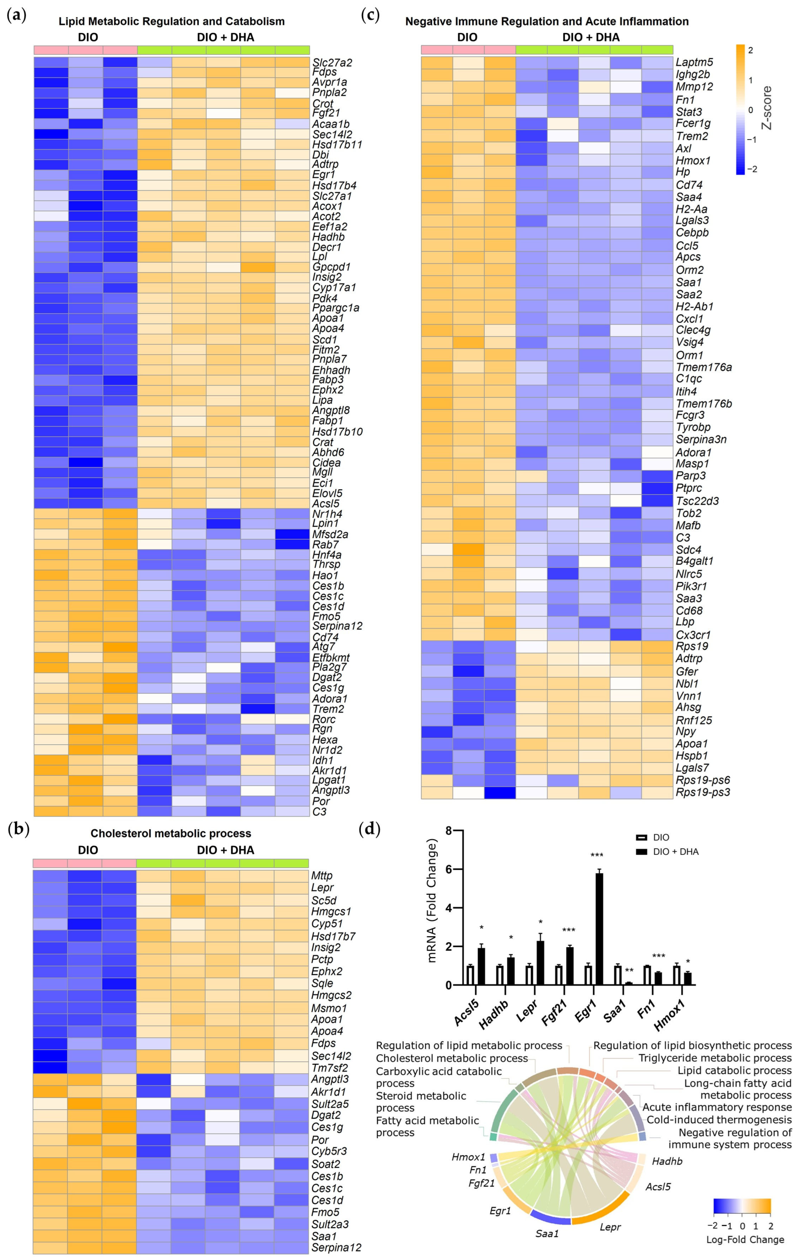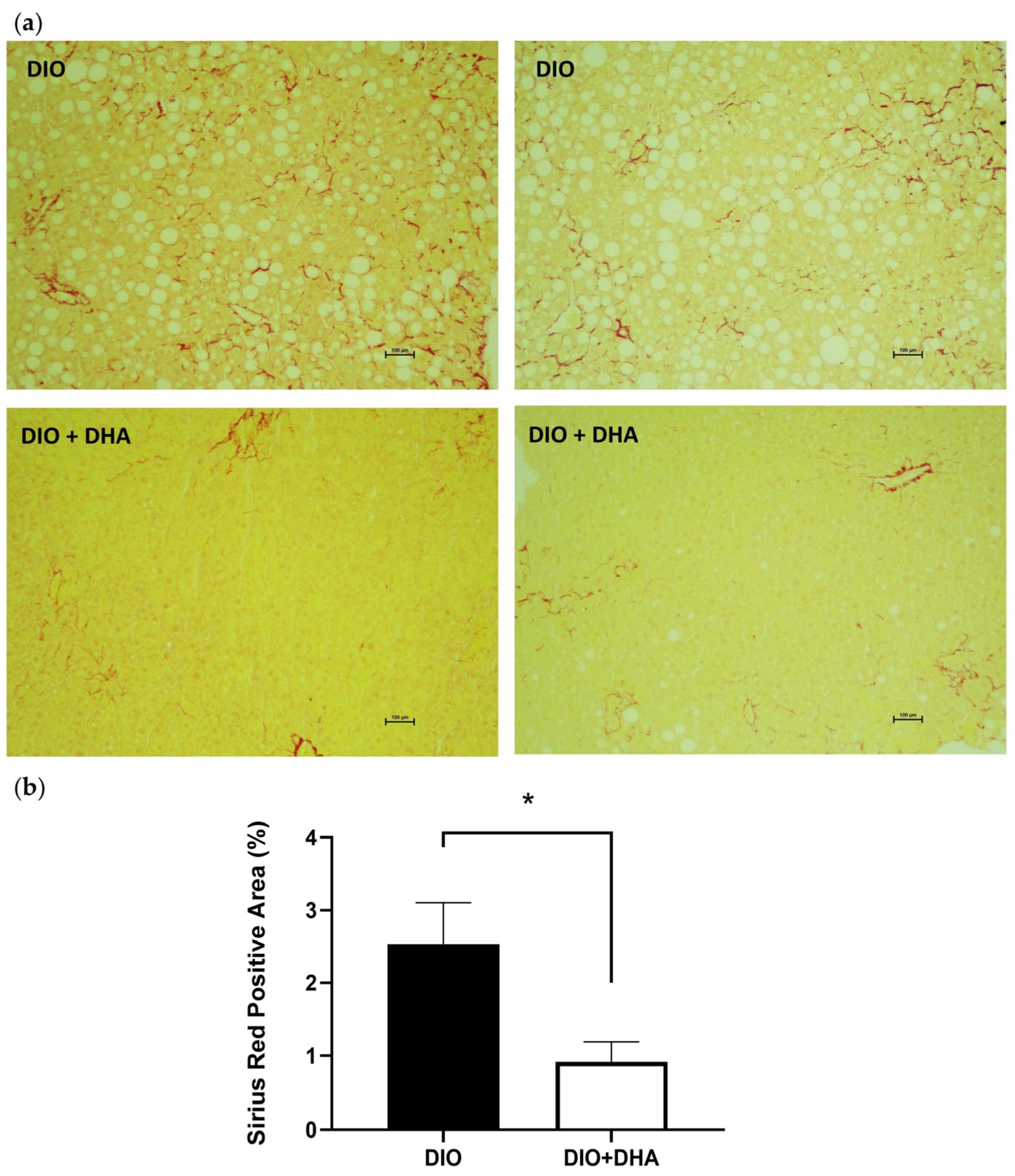 - Luo, X.; He, Z.; Sun, X.; Gu, X.; Zhang, W.; Gao, J.; Li, X.; Jia, R.; Wei, J.; Yu, Y.; et al. DHA Protects Against Hepatic Steatosis by Activating Sirt1 in a High Fat Diet-Induced Nonalcoholic Fatty Liver Disease Mouse Model. Diabetes Metab. Syndr. Obes. 2020, 13, 185–196. [Google Scholar] [CrossRef]