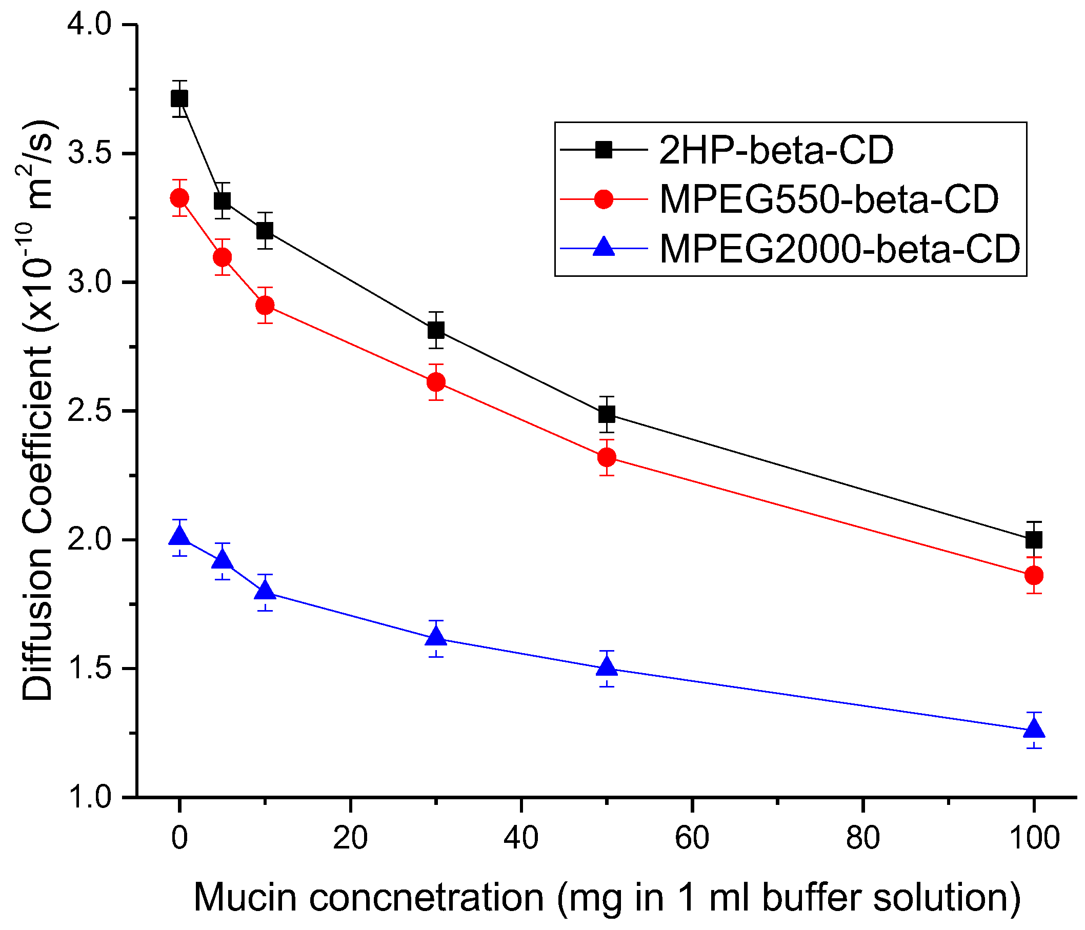 - Nguyen, K.T.H.; Mathias, E.V.; Porter, E.; Ba, Y. Diffusions of β-cyclodextrins in mucus studied by 19F diffusion NMR. J. Incl. Phenom. Macrocycl. Chem. 2016, 86, 273–282. [Google Scholar] [CrossRef]