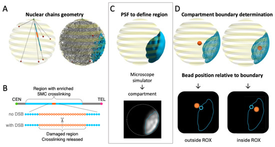 We define an ROX of interest in the genome, as described in the Methods section and as shown in Figure 1A,B. Previous work suggests that the presence of SMCs in a region of chromatin produces a phase-separated membrane-less nuclear sub-compartment, and thus our first goal was to effectively quantify and visualize the geometry of the ROX (relative to itself and the rest of the genome) over time. To do so, we defined the ROX boundary as the 3D surface that encloses 91–94% of all of the positions taken by ROX beads over the course of one simulation (Figure 1C, top); we refer to the volume contained within the ROX boundary as the ROX compartment. The 91–94% percentage range was chosen arbitrarily to be high enough for the ROX compartment to contain the majority of ROX bead positions throughout a simulation’s runtime, but still be able to detect expulsion events as beads exit the compartment. We generated a 2D experimental image by assigning a point-spread-function (PSF) to each of the beads (Figure 1C, bottom). The total signal is thresholded to delineate a boundary around the densest part of the region, computed by connecting regions where the total PSF value equals an arbitrarily chosen value such that the boundary encapsulates 91–94% of the point cloud. In Figure 1D, we show how to determine whether individual beads fall inside or outside the ROX boundary at a given point in time. Through tracking individual beads’ positions relative to the boundary, we can better understand the persistence of the ROX domain geometry and the degree to which ROX versus non-ROX beads explore space.
