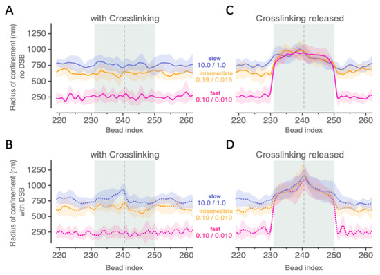 This result is in agreement with previous trends reported in [29] where rigid and flexible clustering were shown to emerge for different crosslinking regimes. Comparing Figure 3A,B, we note that it is the presence and rate of crosslinking rather than the existence of a DSB that dictate the motion of the beads. Although a modest increase in average radii of confinement of beads immediately proximal to the break site occurs in the slow (10/1) crosslinking regime in response to a DSB event, this effect is quite localized and disappears at faster crosslinking regimes.