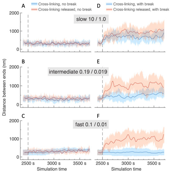 Distances between the two beads immediately proximal to the break site. Plots (A–F) show 3D Euclidean distances between beads 240 and 241 over time, with each row corresponding to a different crosslinking regime and each column corresponding to a different DSB setting. Crosslinking regimes are indicated in the gray boxes above (slow 10/1.0 ton s/toff s, intermediate 0.19/0.019 ton s/toff s, fast 0.1/0.01 ton s/toff s). As before, the DSB (vertical dashed line) between beads 240 and 241 occurs at timestep 2500 s. Each plot (A–F) shows average distances (with standard deviation) of 10 randomly seeded experiments where ROX beads in the damaged region: (i) remain eligible for dynamic crosslinking throughout the simulation (blue), or (ii) release any current cross-links and lose their eligibility to form new ones at the time of the break (red). Only following a DSB (panels (D–F)) do the ends show significant separation, particularly at faster binding kinetics.