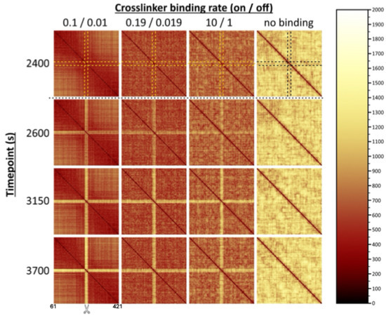 Proximity maps depicting 3D bead-to-bead distances within the ROX at selected points in time. Proximity maps reveal the degree of bead separation (bright yellow cross pattern over time) following depletion of cross-links from the damaged region relative to the rest of the ROX. Each proximity map displays data corresponding to the ROX (361 beads from 61 to 421 of the right arm of Chromosome XII as depicted in Figure 1) and was produced through averaging bead-to-bead distances for 10 distinct simulations at a specific point in time. The 16 plots composing this figure consider 40 total simulations, all reflecting an intact ROX with localized cross-link depletion. The four plots in a given column correspond to the rate of crosslinking in the ROX (“fast” 0.1/0.01 s; “intermediate” 0.19/0.019 s; “slow” 10/1 s; “no crosslinking”) across, at 2400, 2600, 3150, 3700 s of simulation, from top to bottom. Beads closer to each other are indicated by darker colors, bead separation is depicted in lighter colors (scale on right). Depletion of cross-links begins 2500 s after the start of simulation and is shown by the dotted line. Position of the chromosomal break (between beads 240 and 241) is marked by scissors. Cross-links are depleted from beads 231–250, indicated by the dashed yellow lines in the t = 2400 s (top row, prior to depletion. Beads 231–250 remain in proximity prior to 2500 s. Separation of the damaged region is visible at 100 s after depletion (seen in 2600 s row as a yellow cross in the center of the proximity map, growing brighter as time progresses (2600–3700, going down). Color bar units are in nm.
