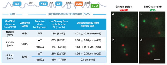 Upon addition of glucose to the growth media, galactose promoter is repressed and the dicentric chromosome is activated. Both functional centromeres (endogenous CEN3 and GalCEN) recruit kinetochores and about 50% are pulled toward opposing spindle poles, thus creating a physical conflict which results in a chromosome break. Most DSBs accumulate near the centromeres, with a small fraction occurring in between the two centromeres [17,36]. When the GalCEN is placed 46.3 kb away from CEN3 we observe a pericentric LacO, positioned near CEN3 (Figure 6) displaced from the spindle axis (SPB-SPB) in only 3% of cells. In strains with GalCEN positioned 12.3 kb and 9.8 kb from CEN3 (at GBP2 and ILV6, respectively) the dicentric chromosome is predicted to break in the pericentrome. However, following the DSB event in those strains, the LacO is displaced from the spindle in 21–22% of observed cells (p-value < 0.0001; Supplementary Data). This is evidence of a high degree of re-organization of pericentric chromatin (also known as the bottlebrush) following a local break. Pericentric chromatin of a mitotic chromosome is typically enriched in loops stabilized by an accumulation of crosslinking proteins (SMCs). The increase in LacO displacement following a break in the centromere suggests that cross-linking is extensively and transiently diminished at regions proximal to the break as a step of a molecular pathway preceding efficient repair.