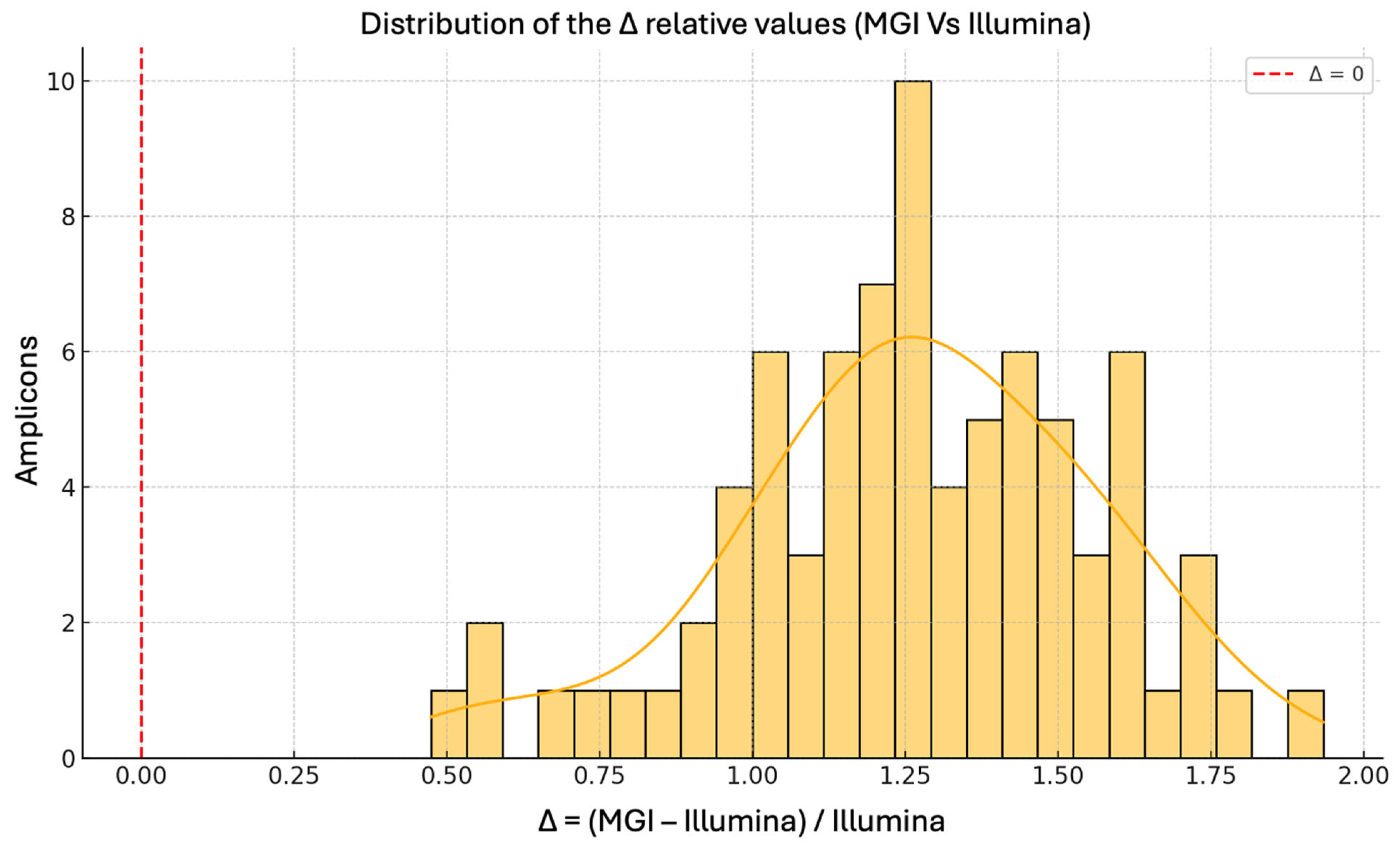 Figure 2 illustrates the distribution of the relative change in average coverage per amplicon between MGI and Illumina platforms, calculated as Δ = (MGI/Illumina) − 1. All Δ values are positive, confirming that MGI consistently outperformed Illumina in terms of sequencing depth across every amplicon within the CFTR panel.