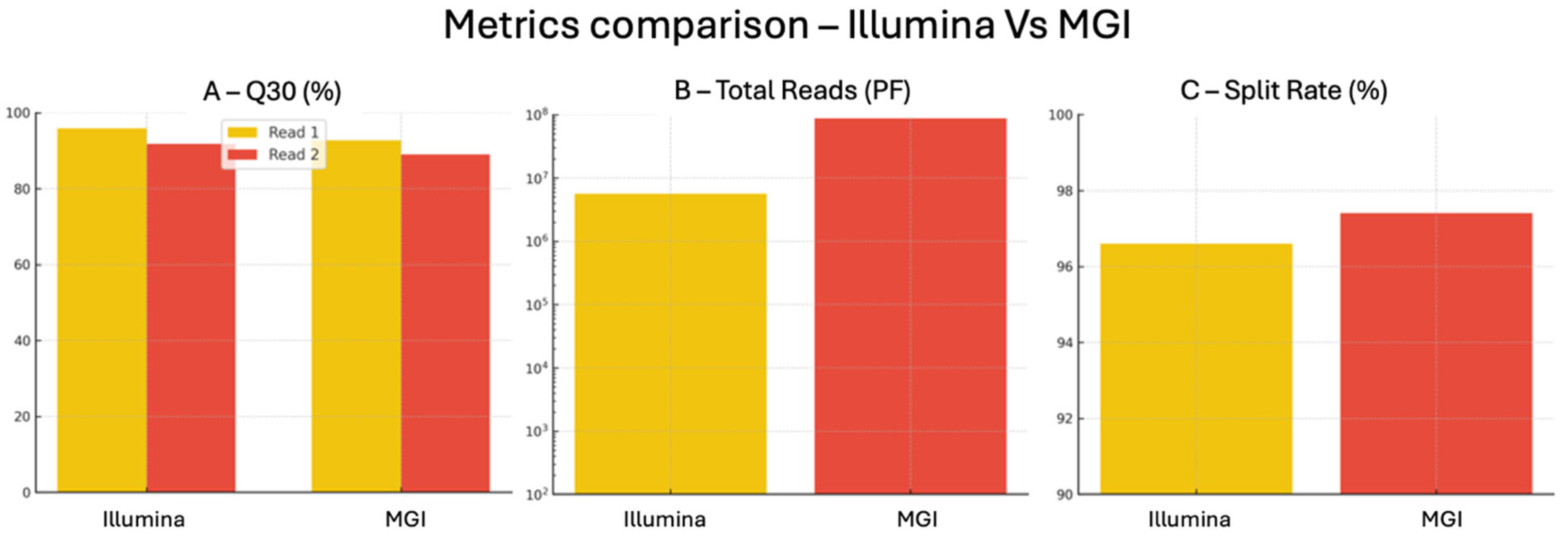 While Illumina provided marginally superior quality scores and synchronization metrics, the MGI platform delivered significantly greater sequencing output, slightly better demultiplexing, and a broader set of performance diagnostics. Both systems met or exceeded key quality benchmarks and demonstrated full compatibility with the targeted