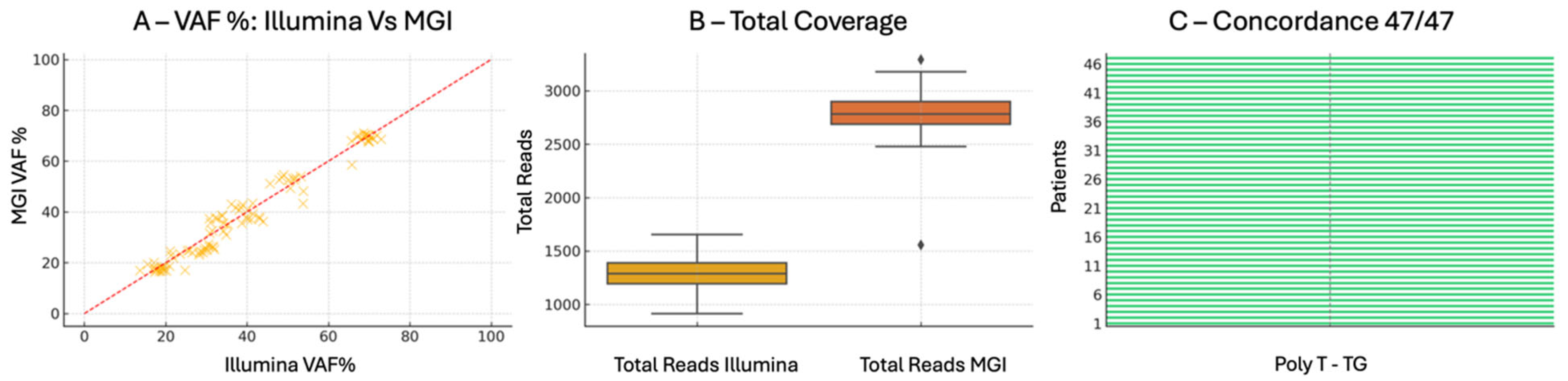 Figure 3, support the analytical equivalence of Illumina and MGI platforms for diagnostic grade sequencing and offer laboratories the flexibility to adopt either platform depending on sample throughput needs, technological infrastructure, and cost-efficiency considerations.