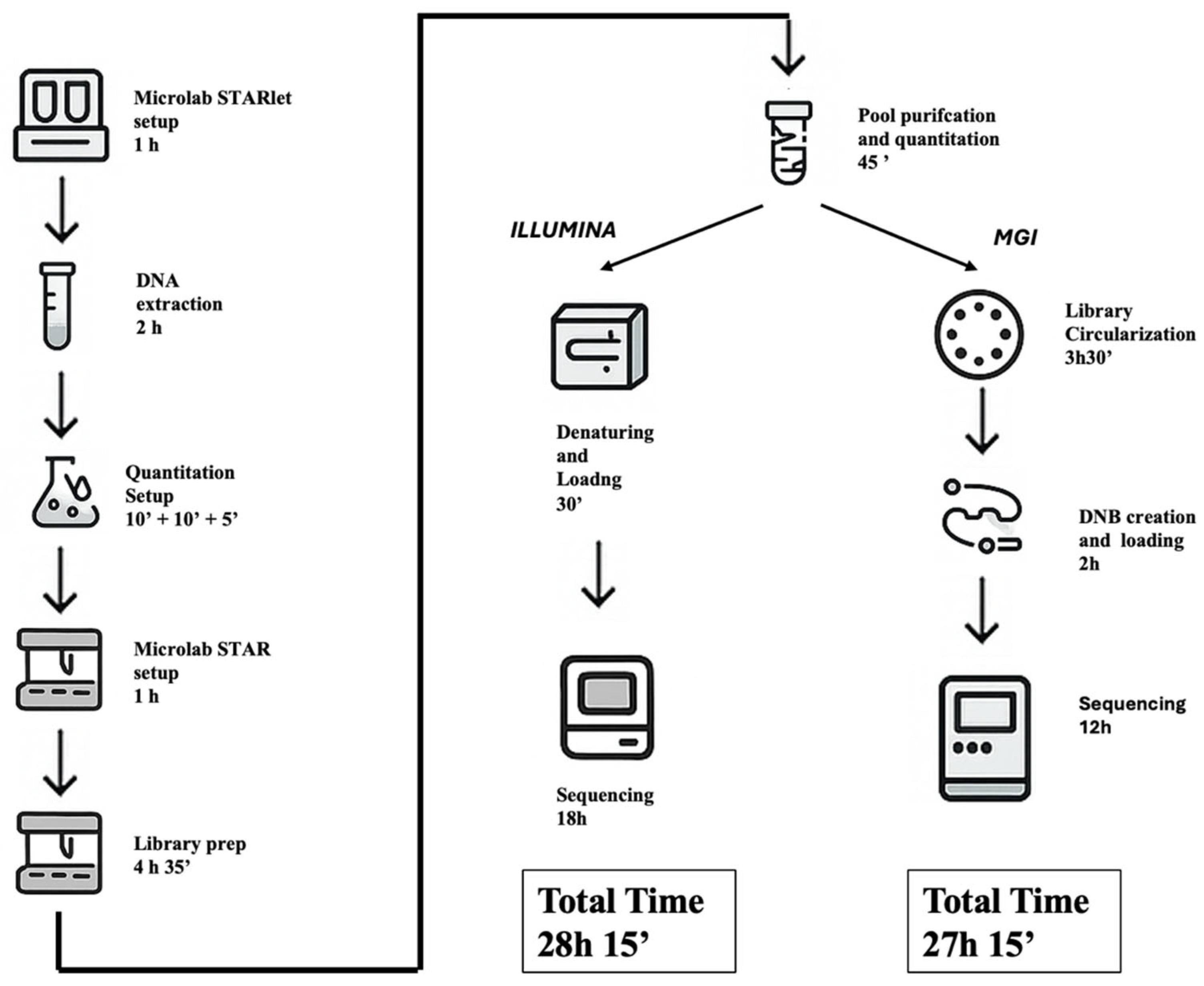 Illumina workflow, inclusive of extraction, library preparation, pooling, purification, quantification, and sequencing, required approximately 28 h and 15 min to complete, primarily driven by the longer sequencing runtime (~18 h on MiSeqDx). In contrast, the MGI workflow completed the full process in approximately 27 h and 15 min, benefiting from faster sequencing (~12 h on DNBSEQ-G99RS)