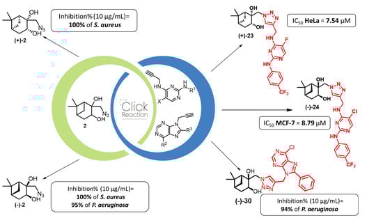 1,2,3-Triazolo-Bridged Click Coupling of Pinane-Based Azidodiol Enantiomers with Pyrimidine- and Purine-Based Building Blocks: Synthesis, Antiproliferative, and Antimicrobial Evaluation