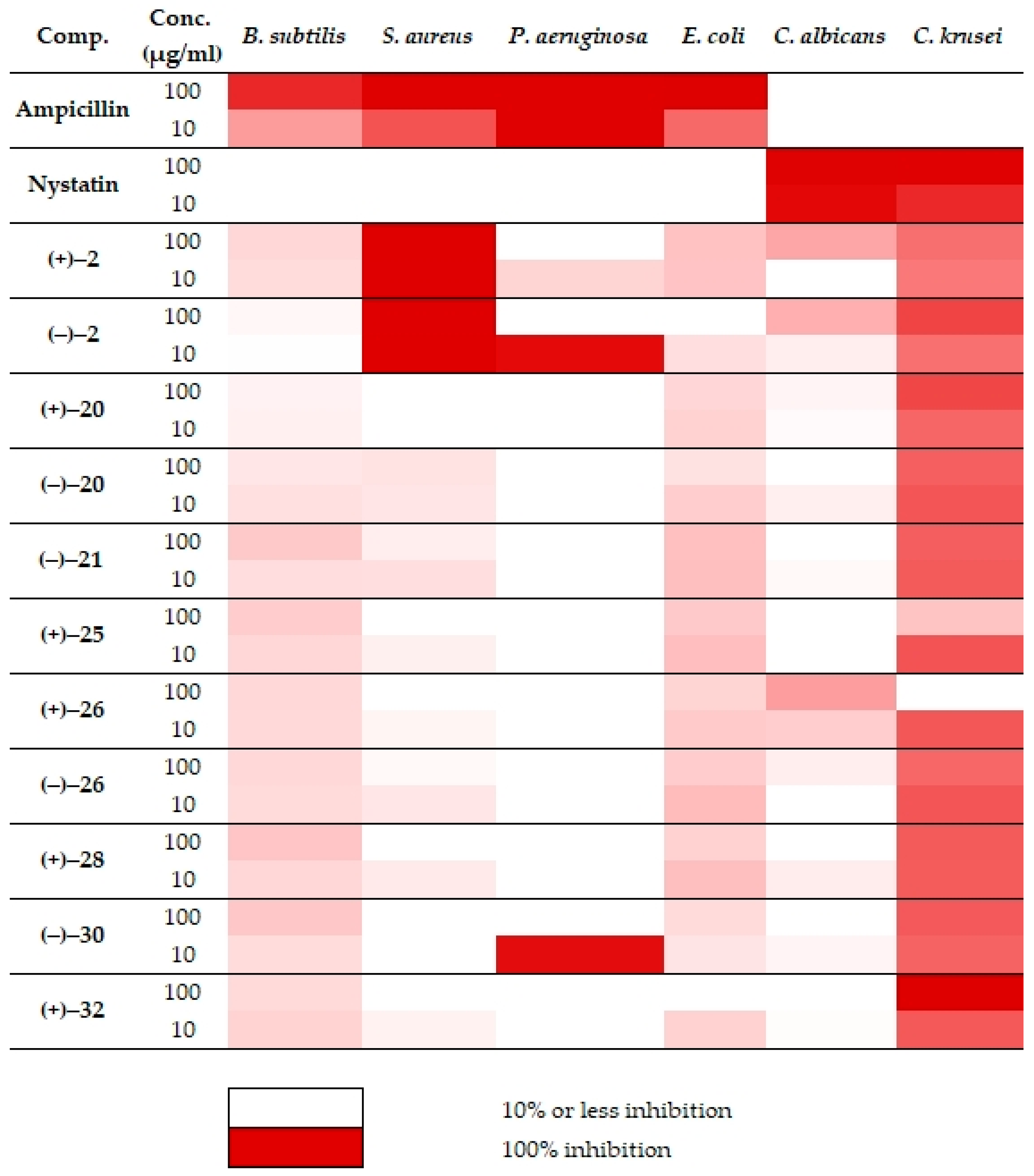 | (+)-26 | 100 | 16.2 ± 8.6 | 0 | 0 | 17.8 ± 4.6 | 39.7 ± 3.8 | 0 |