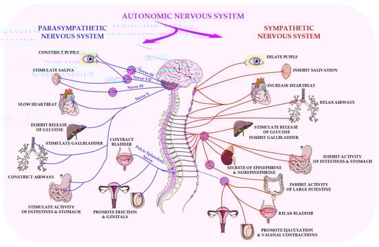 - Waxenbaum, J.A.; Reddy, V.; Varacallo, M.A. Anatomy, Autonomic Nervous System. In StatPearls; StatPearls Publishing: Treasure Island, FL, USA, 2025; [Updated 24 July 2023]. [Google Scholar]