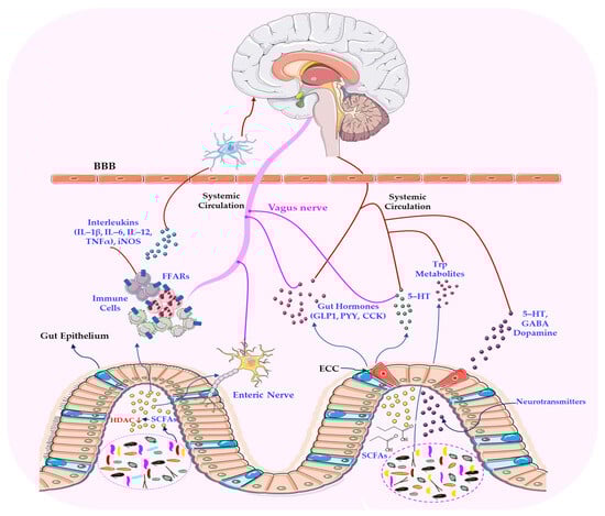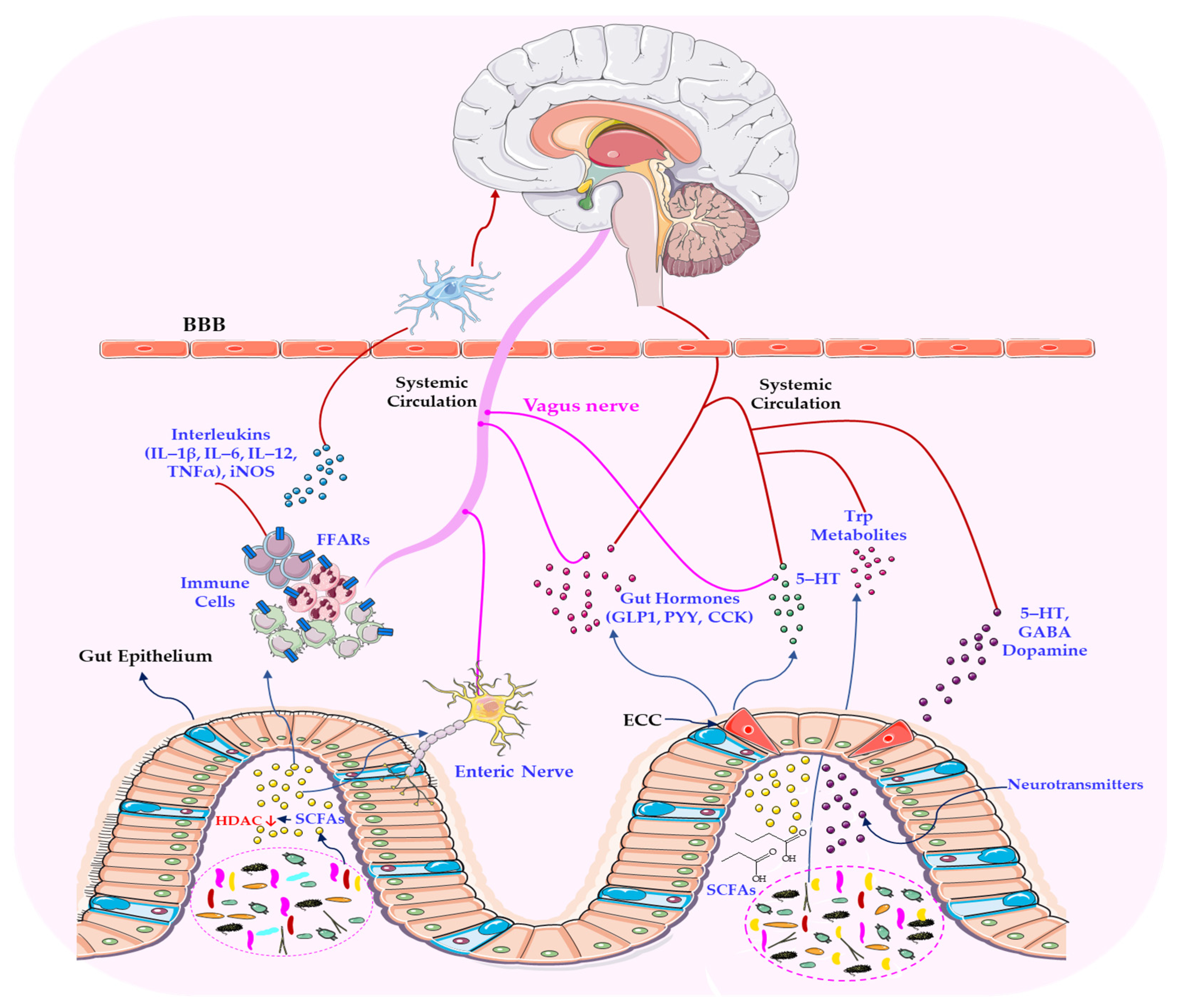 - Dong, T.S.; Mayer, E. Advances in Brain-Gut-Microbiome Interactions: A Comprehensive Update on Signaling Mechanisms, Disorders, and Therapeutic Implications. Cell. Mol. Gastroenterol. Hepatol. 2024, 18, 1–13. [Google Scholar] [CrossRef]