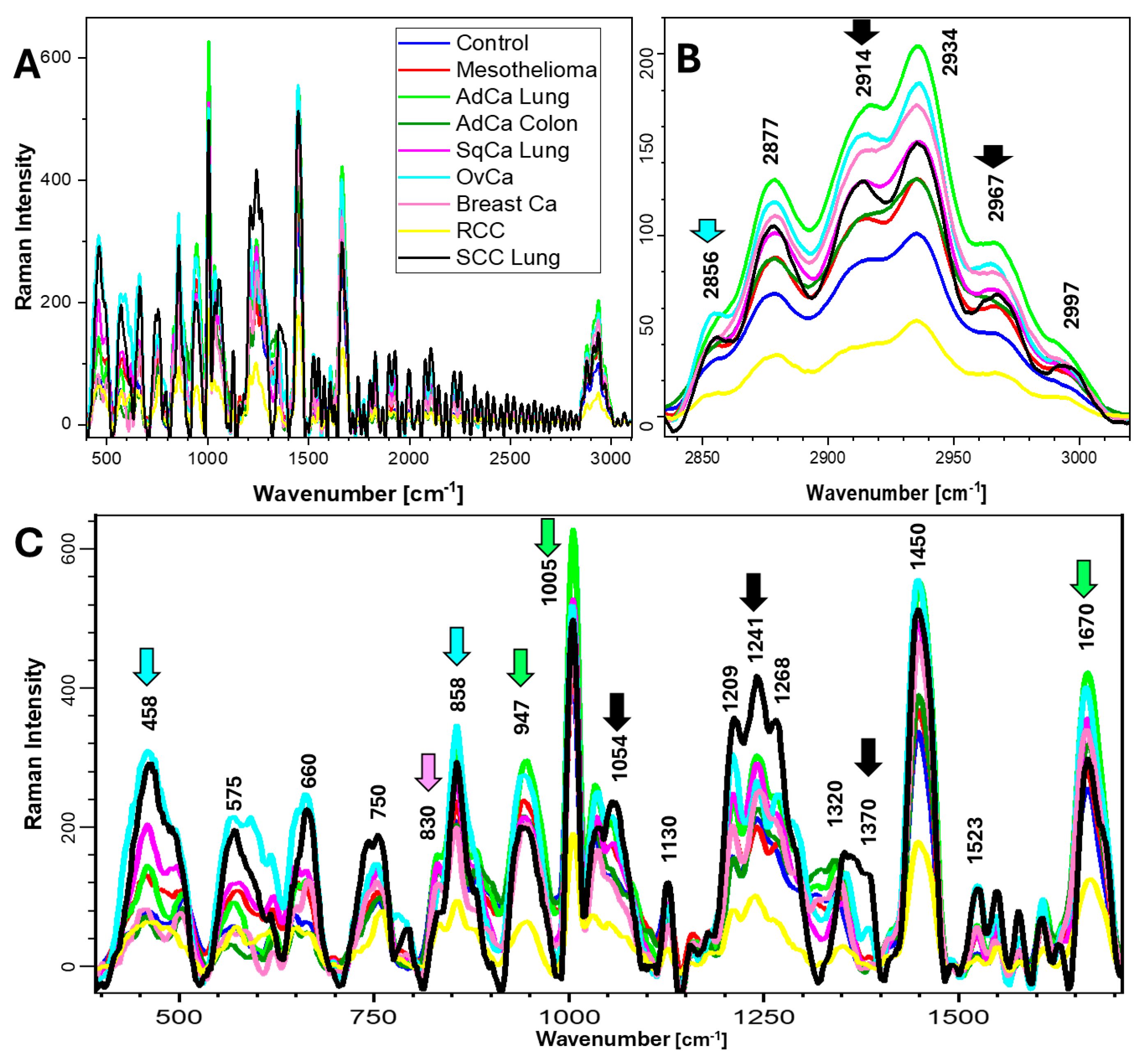 - Bhattacharjee, T.; Tawde, S.; Hudlikar, R.; Mahimkar, M.; Maru, G.; Ingle, A.; Murali Krishna, C. Ex vivo Raman spectroscopic study of breast metastatic lesions in lungs in animal models. J. Biomed. Opt. 2015, 20, 85006. [Google Scholar] [CrossRef]