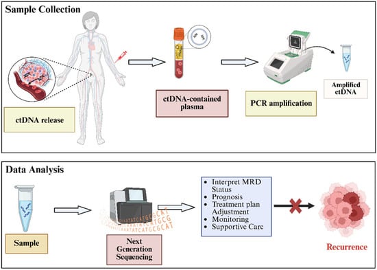 Minimal Residual Disease (MRD) refers to the persistence of a small number of cancer cells, often in the form of DNA fragments or proteins, that remain in the patient’s body during or after treatment despite clinical remission. These residual cells are undetectable by conventional medical imaging, routine screening techniques, or standard histopathological analysis. The concept of MRD was initially introduced in the context of acute lymphoblastic leukemia and acute myeloid leukemia [14]. Over the past decade, with advances in sensitive detection technologies, MRD research has expanded its scope beyond hematologic malignancies to solid tumors, such as breast, colorectal, lung, ovarian, and other cancer types, signifying its growing prognostic importance. While hematological cancer predominantly depends on multiparameter flow cytometry (MPFC) and real-time quantitative polymerase chain reaction (RT-qPCR) for MRD detection, solid tumors employ different approaches due to their distinct biological properties, including differences in cellular distribution, genetic characteristics, and microenvironment [15]. In this context, ctDNA analysis via liquid biopsy has emerged as the primary modality through next-generation sequencing (NGS)-based evaluation for comprehensive tumor-specific mutations [16]. Thus, this approach could offer insights into patient survival outcomes while assisting clinicians in evaluating tumor stage and therapy response.