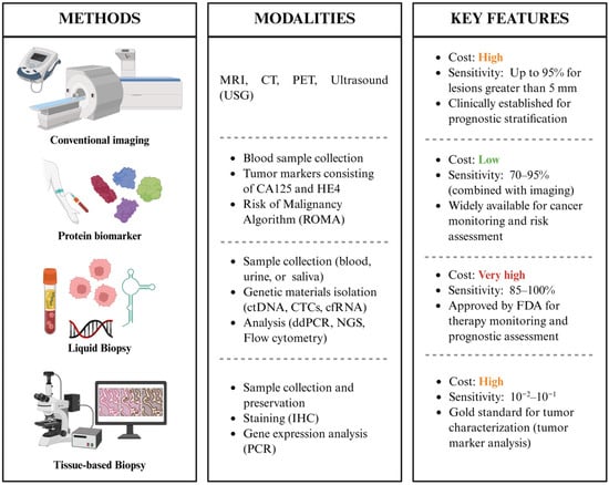 Despite these advances, significant challenges remain in recognizing early recurrence and maintaining clinical remission. These limitations may delay diagnosis, limit therapeutic options, and ultimately decrease survival rates. The application of CA125 is limited by false positives and poor correlation with recurrence, with diagnostic accuracy of only 13% [6,7]. In addition, conventional imaging methods, including computed tomography (CT), positron emission tomography (PET), magnetic resonance imaging (MRI), and ultrasonography (USG), are also ineffective in identifying microscopic residual disease, particularly lesions smaller than 5 mm, and are unable to identify tumor heterogeneity [8,9,10].