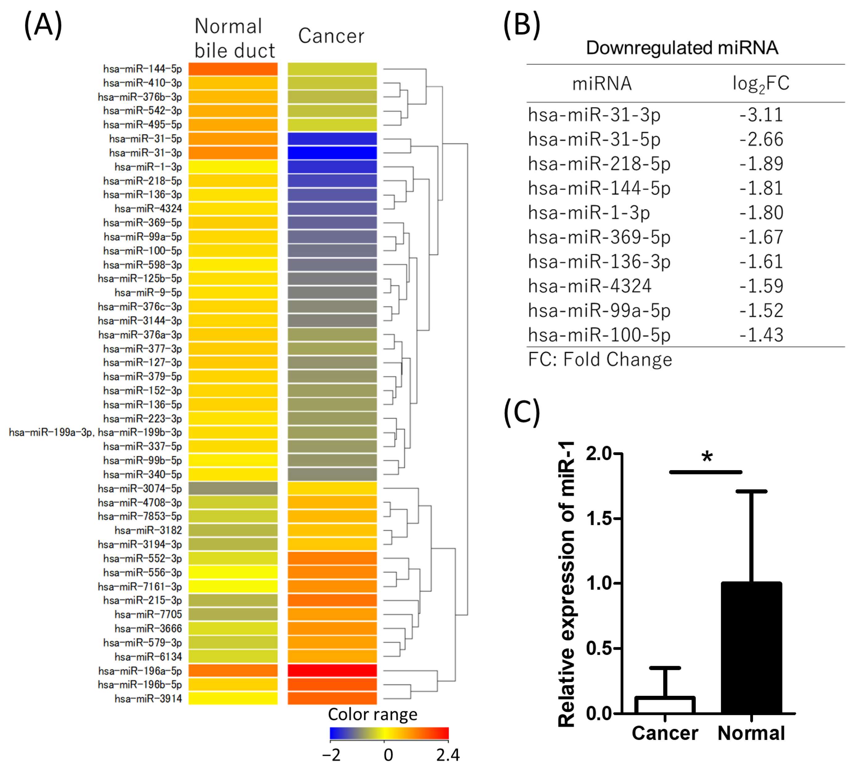 Figure 1. MicroRNA microarray and qRT-PCR of miR-1 of CCA tissue. Microarray data were normalized, and fold changes (FC) were calculated as the expression in cancer tissue relative to normal bile duct tissue. (A) MicroRNA microarray heatmap showed 30 downregulated miRNAs (log2FC < −1.0) and 16 upregulated miRNAs (log2FC > 1.0) in bile duct cancer. (B) The most downregulated miRNAs identified in the microarray are listed. (C) qRT-PCR validation shows that miR-1 expression is significantly downregulated in cancer tissue. * p < 0.001 compared to normal bile duct group.