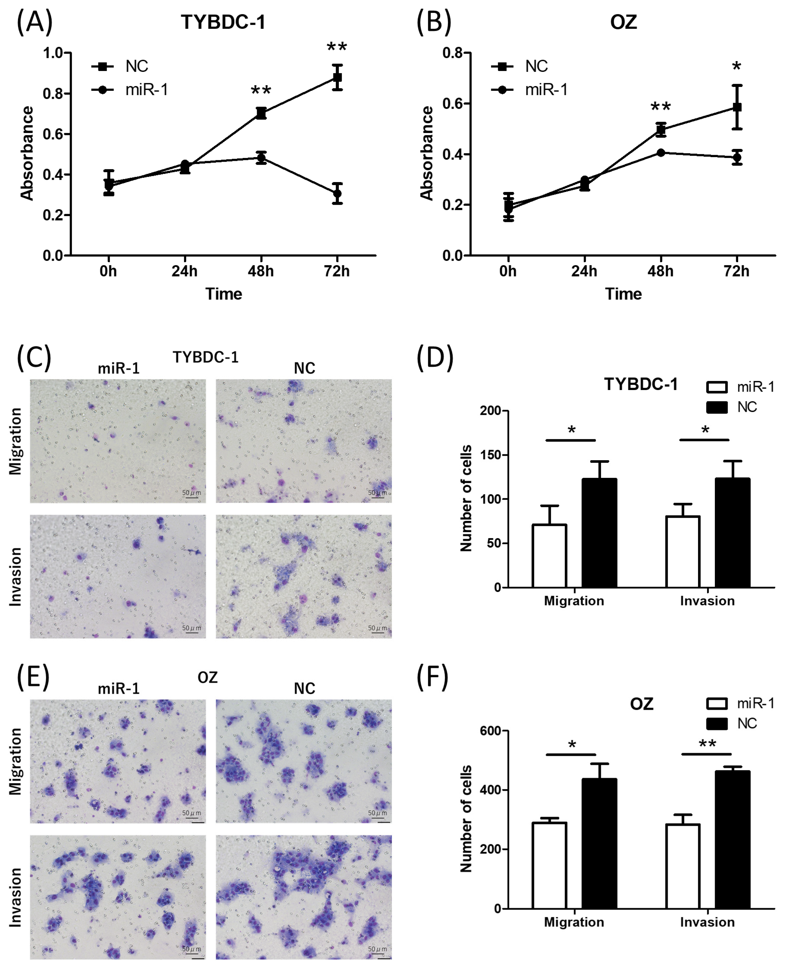 Figure 2. Proliferation assay and migration/invasion assay of CCA cell lines by miR-1 transfection. (A,B) Cell proliferation was suppressed by miR-1 transfection in TYBDC-1 and OZ cells at 48 and 72 h, respectively. (CF) Cell migration and invasion were suppressed by miR-1 transfection in TYBDC-1 and OZ cells. * p < 0.05 and ** p < 0.001 compared to negative control (NC).