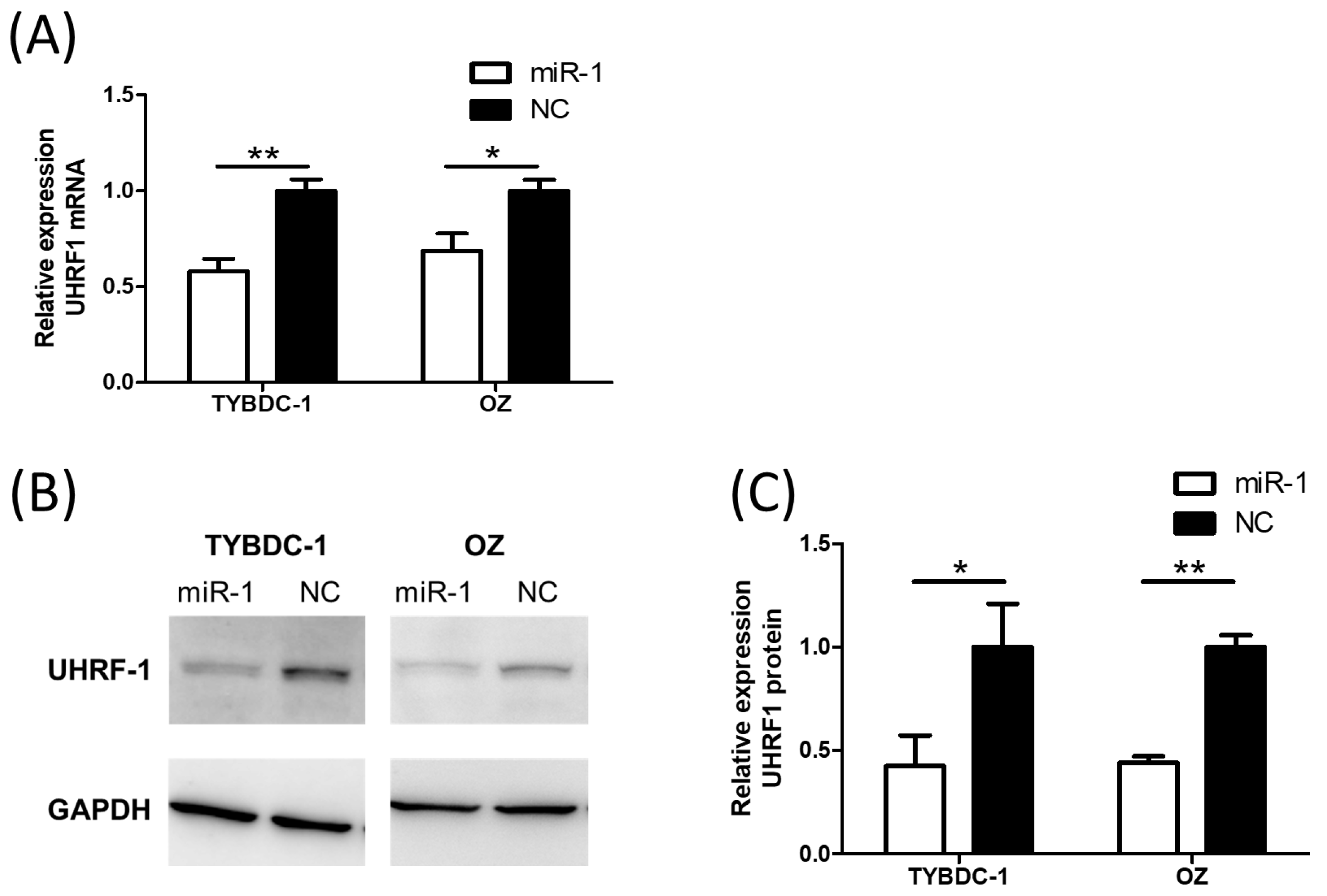 TYBDC-1 and OZ cells were seeded at a density of 0.3 × 106/well in 6-well plates, and transfected with miR-1 and negative control mimics (TYBDC-1:50 nM, OZ:50 nM) 48 h after cell seeding. Transfected cells were lysed with RIPA Lysis and Extraction Buffer (Thermo Scientific: Thermo Fisher Scientific Inc., Waltham, MA, USA) 48 h after transfection. Protein lysates were electrophoresed using SDS-PAGE on a 4–20% polyacrylamide gel and transferred to a PVDF membrane (Invitrogen). Membranes were incubated overnight at 4 °C with primary antibody against UHRF1 (SAB1405050, Sigma-Aldrich), and at room temperature for 1 h with GAPDH (G8795, Sigma-Aldrich). HRP-conjugated Goat Anti-Mouse IgG antibody (ab6789, Abcam, Cambridge, UK) was used as the secondary antibody, and membranes were incubated at room temperature for 1 h. The bands were visualized using ECL with SuperSignal West Pico PLUS Chemiluminescent Substrate (Thermo Scientific). Protein expression levels were analyzed using ImageJ software (version 1.53a; National Institutes of Health, Bethesda, MD, USA) and normalized to GAPDH.
