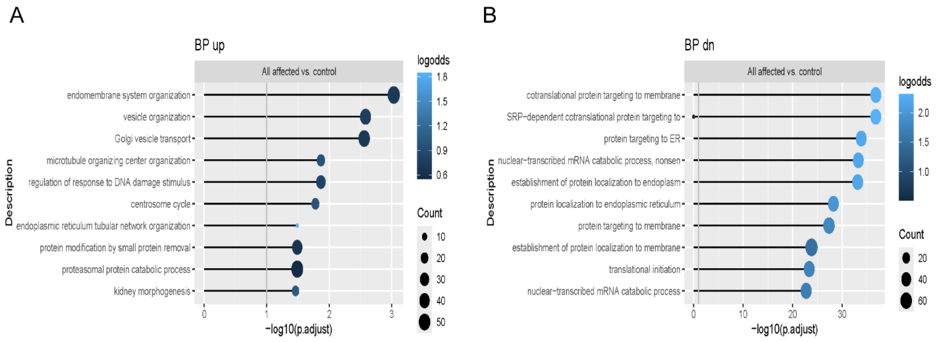 RNA-Seq showed upregulation in genes related to vesicle organization, Golgi vesicle transport, and proteasomal protein degradation when the full group of OI patient osteoblasts was compared to controls (Figure 1A). Interestingly, genes downregulated in patient osteoblasts were enriched in several pathways related to protein translation (Figure 1B).